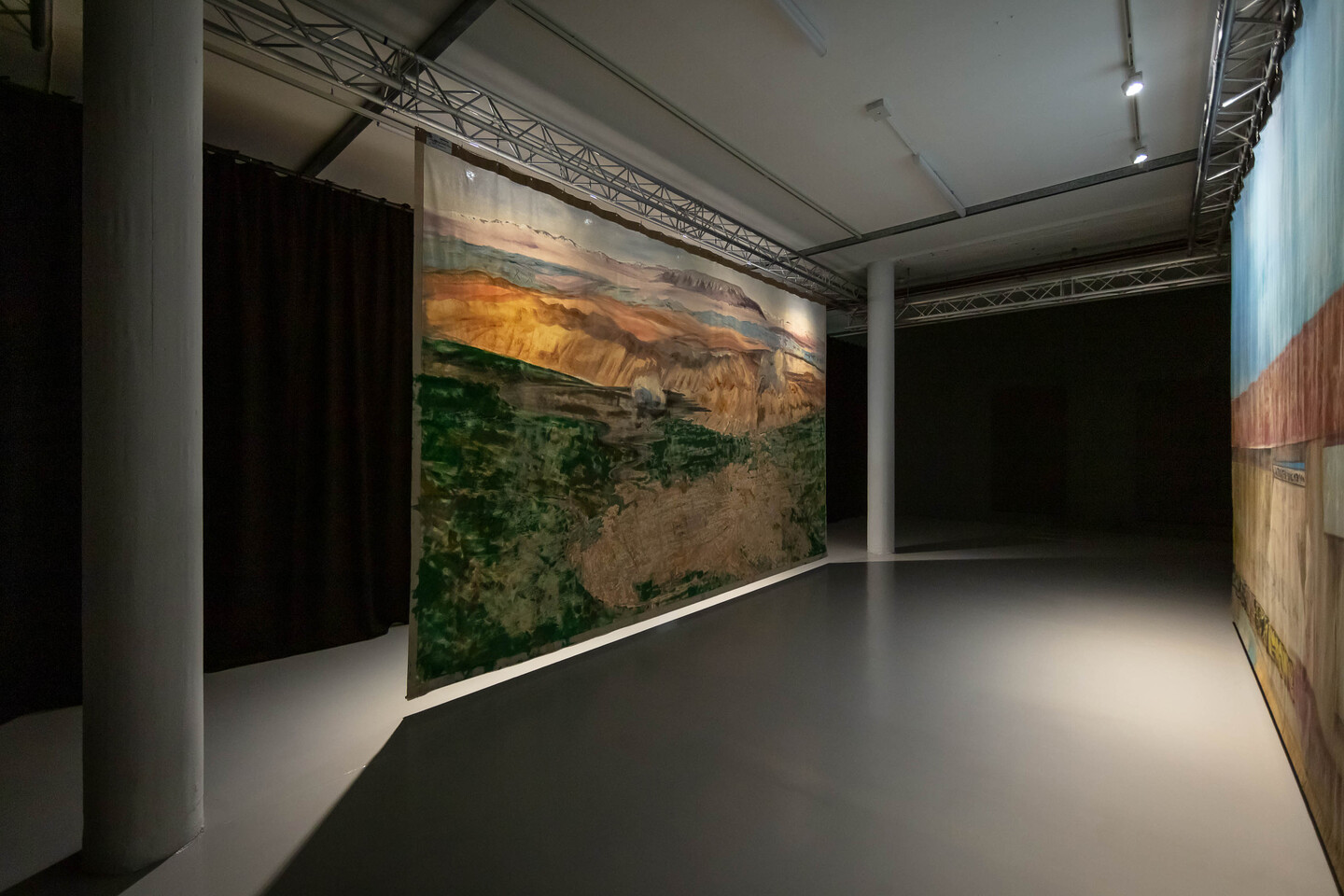 video installation including a single-channel video, and two hand-painted theatrical backdrops (cotton muslin, casein, acrylic urethane, corn husk size, pigment), video: 15 min, backdrops: 609 × 365 cm, each