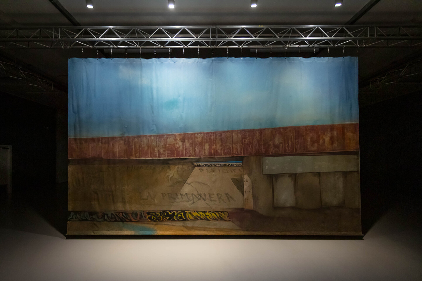 Each act is demarcated by a scenographic change in the hand-painted backdrop on the Opera House stage. First, we see the original backdrop of a picturesque Venice canal, followed by two newly commissioned scenes that are part of the installation. One references a 1920 painting by British artist Richard Carline (1898–1980) of an aerial view of Damascus and its surrounding landscape, and the other the concrete culvert in El Paso-Juárez where the 2010 cross-border shooting took place.