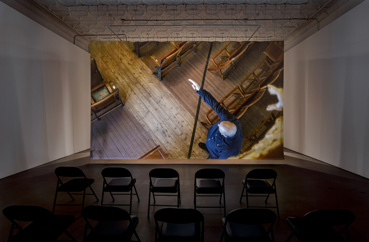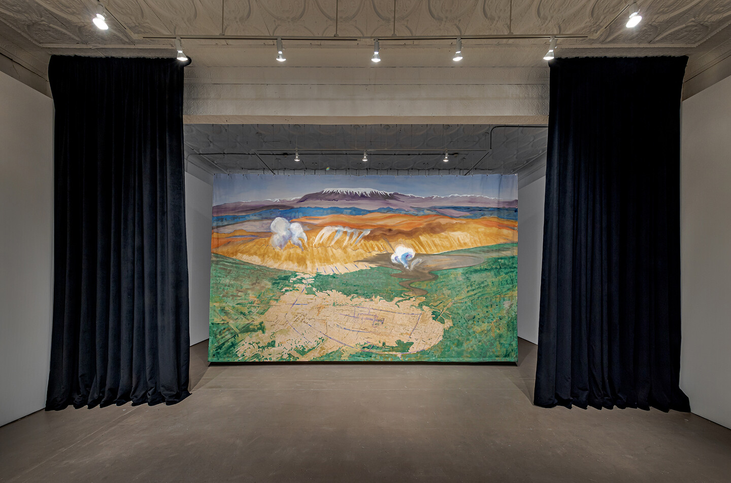 video installation including a single-channel video, and two hand-painted theatrical backdrops (cotton muslin, casein, acrylic urethane, corn husk size, pigment), video: 15 min, backdrops: 609 × 365 cm, each