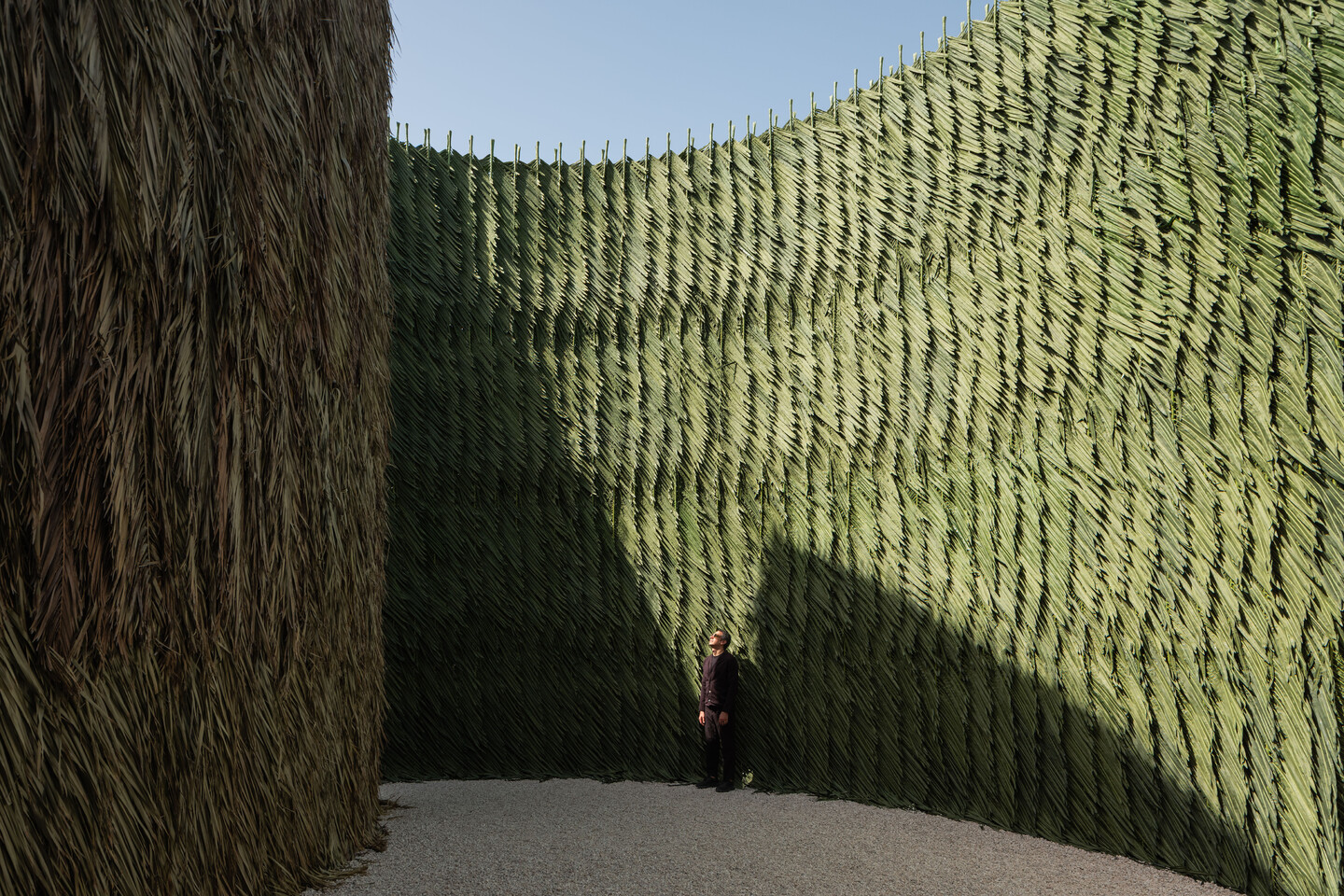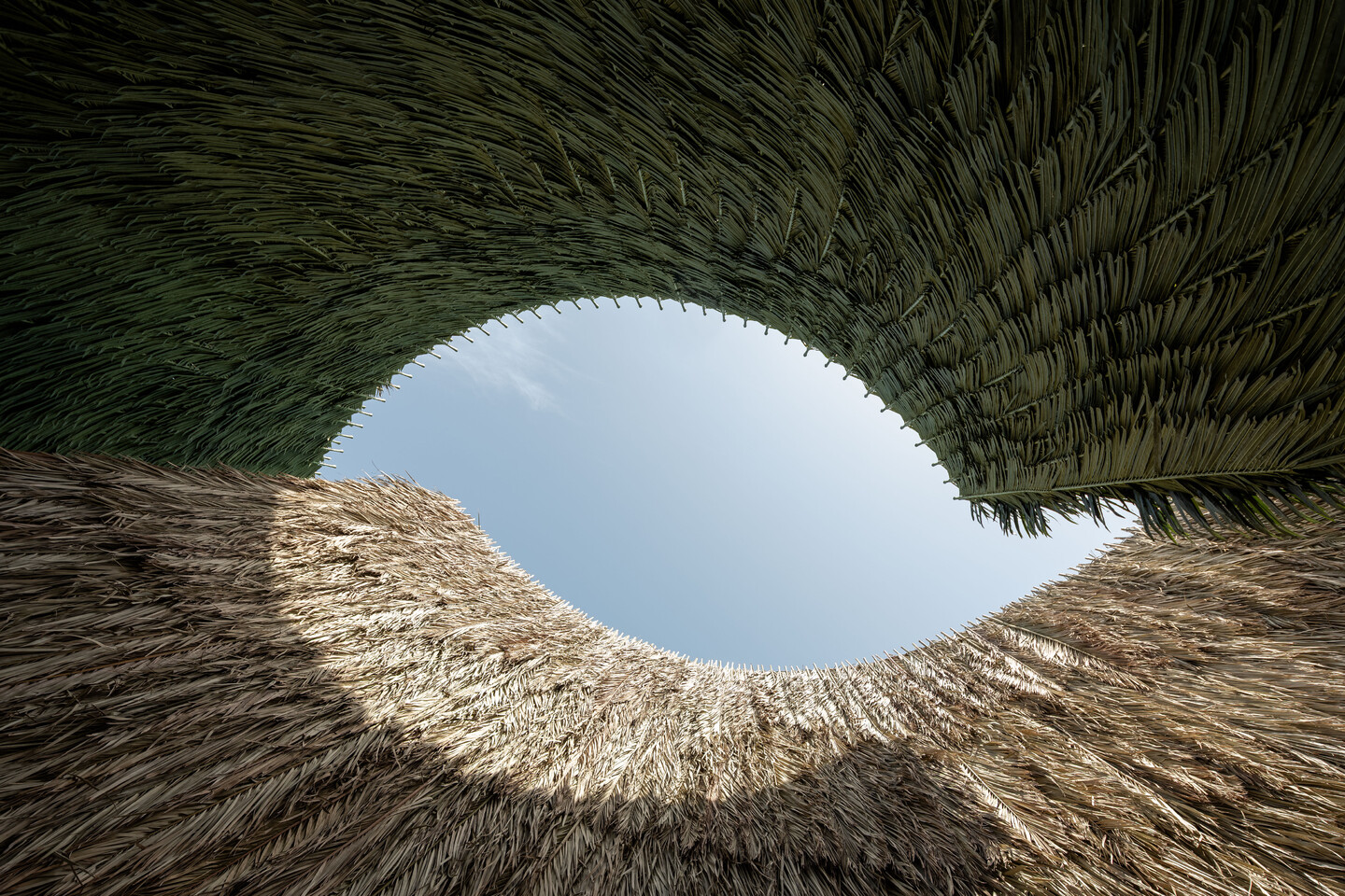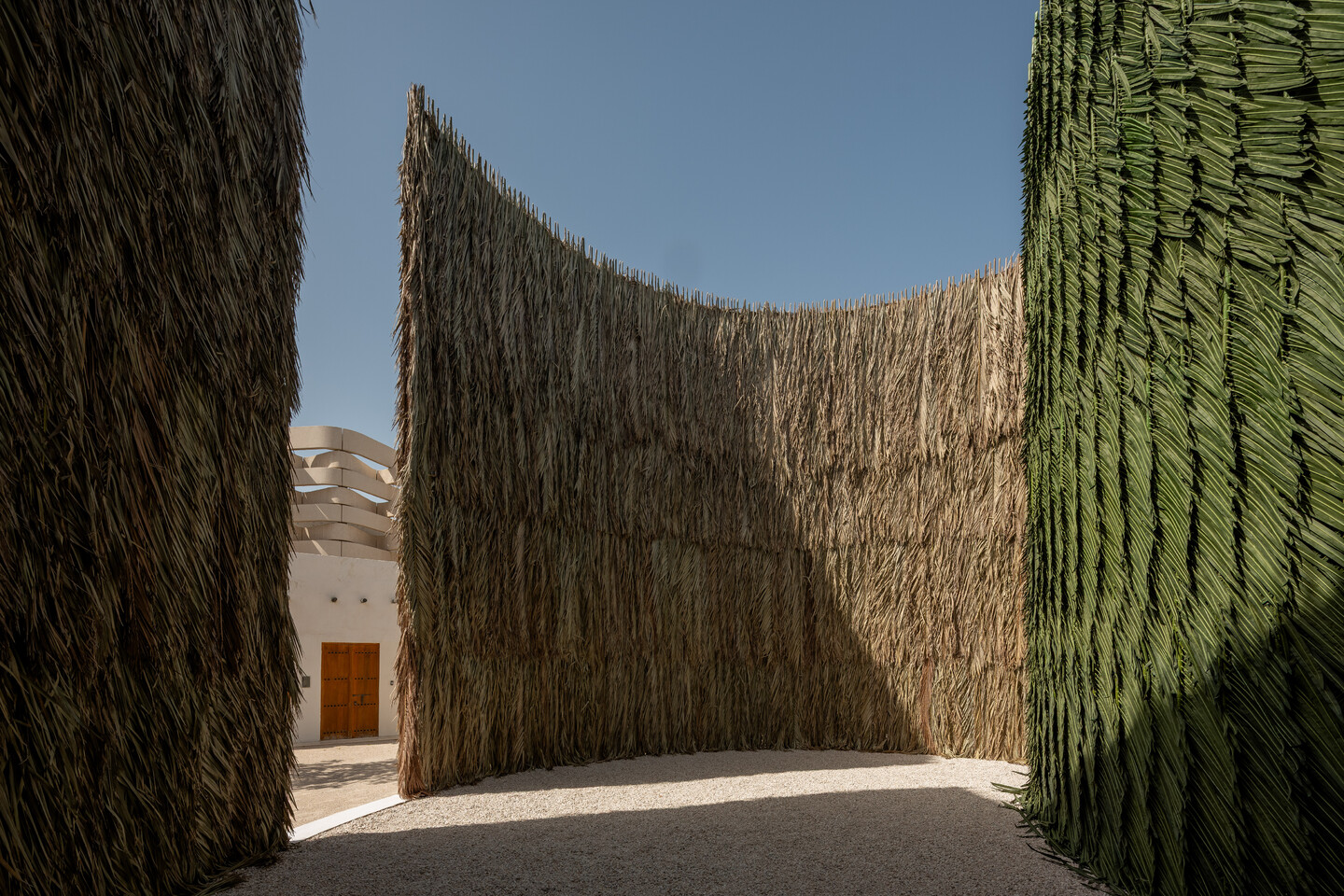The pavilion consists of two intersecting circular structures—each 10 meters in diameter and 7.5 meters high—overlapping to form a shared, sheltered interior. One volume is clad in natural palm fronds sourced from date farms in Doha, while the other is wrapped in artificial fronds, creating a tactile dialogue between the organic and the manufactured. This confrontation between materials mirrors the broader transition from the natural to the synthetic, from the real to the imagined—a key register of “Becoming” in the Gulf’s rapidly shifting cultural and ecological landscapes.