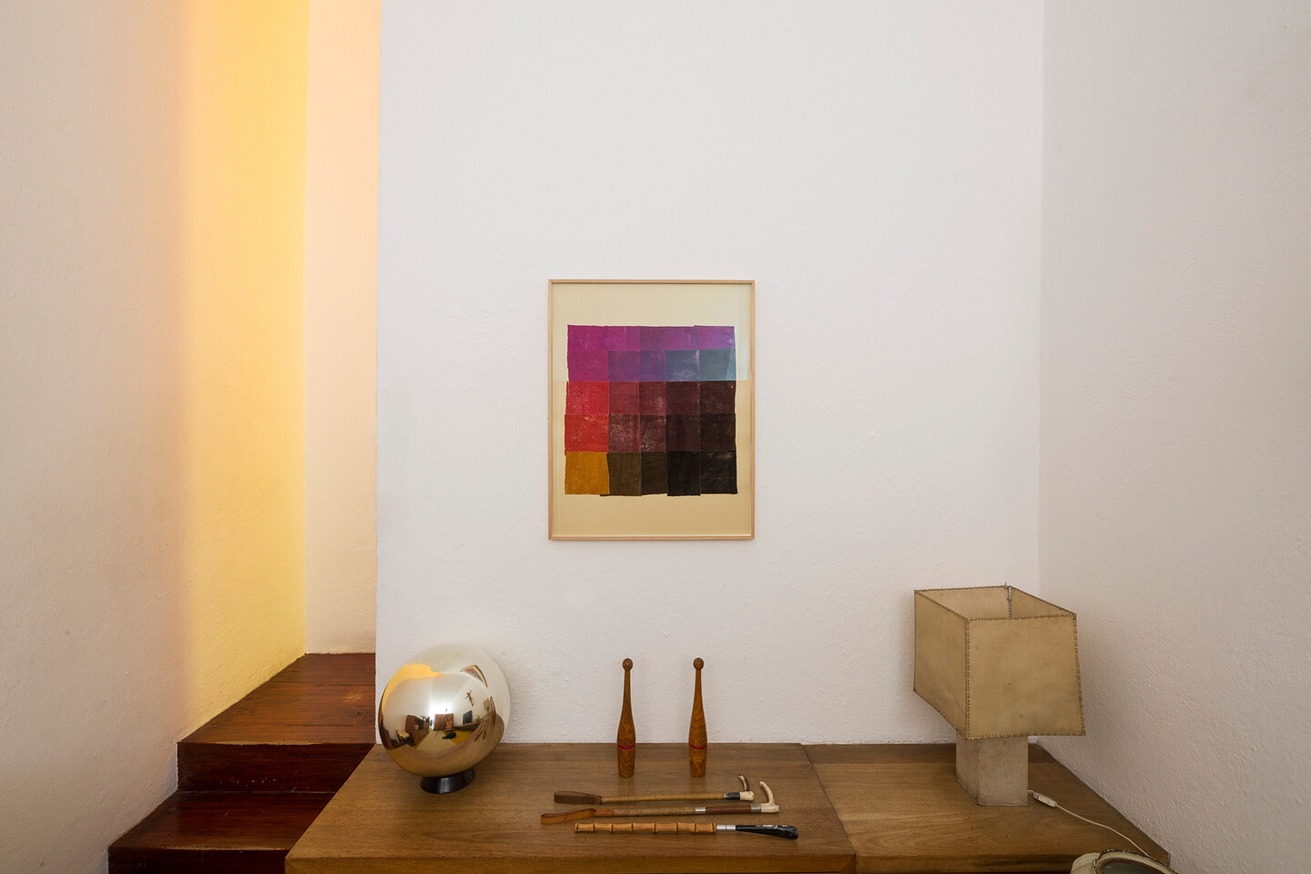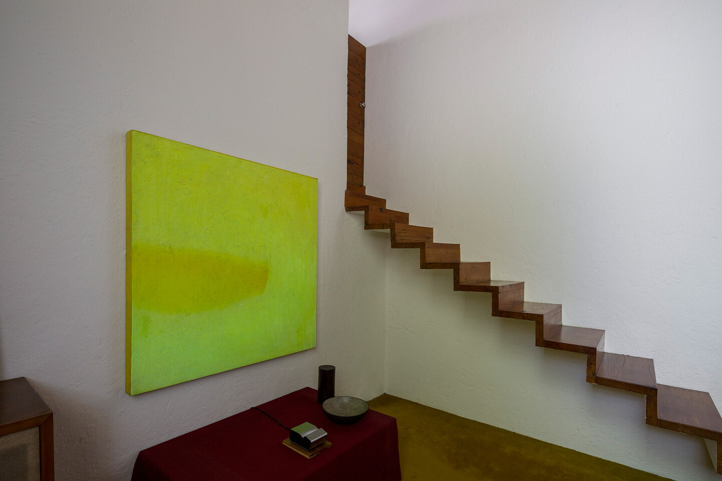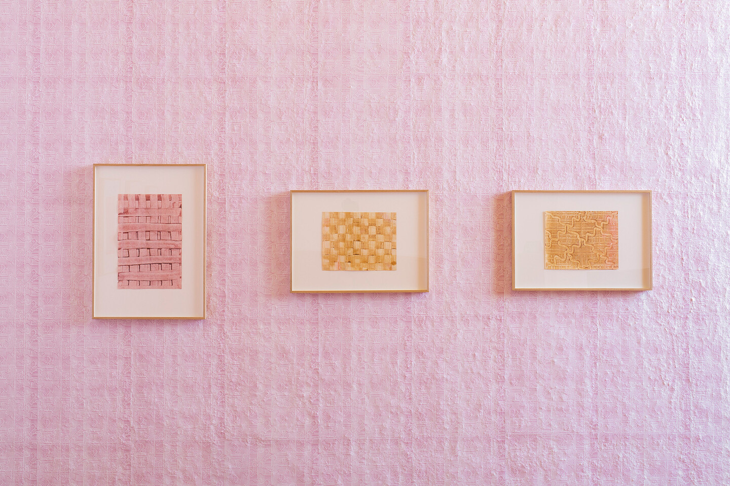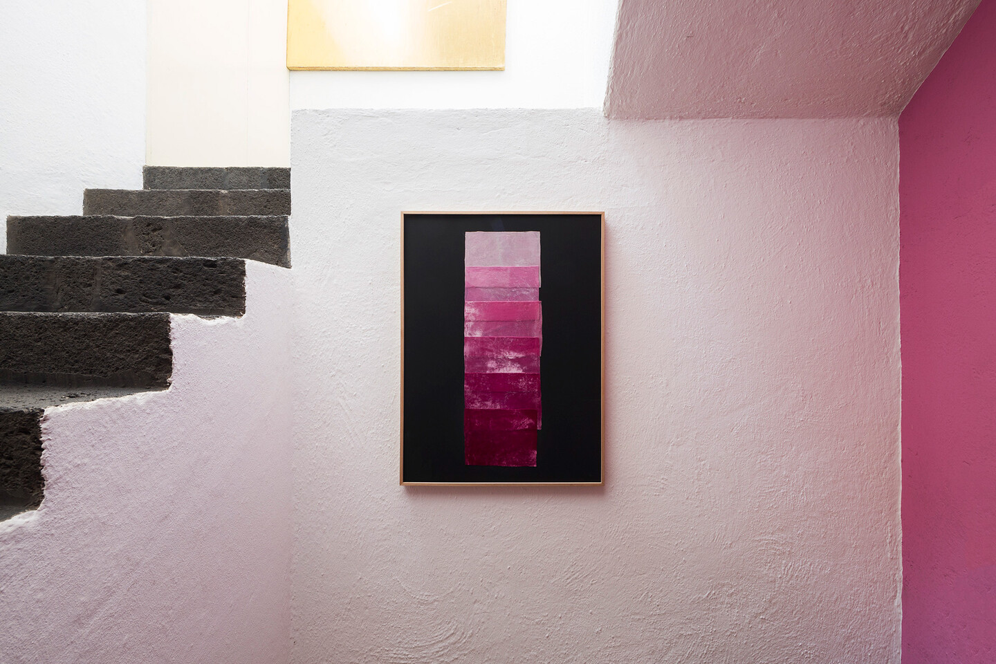 Dispersed throughout the rooms of the house we also find five chromatic collages, the Practice Pieces (Color Charts) (2019), made with hand-dyed silk velvets. Inspired by dyers and the color sampling systems used in textile conservation, these pieces are inscribed within Yto Barrada’s long-standing interest in educational materials, platforms, and structures. Both Mexico and Morocco boast long respective histories of natural dye production with organic materials such as cochineal, indigo, and Tyrian purple.