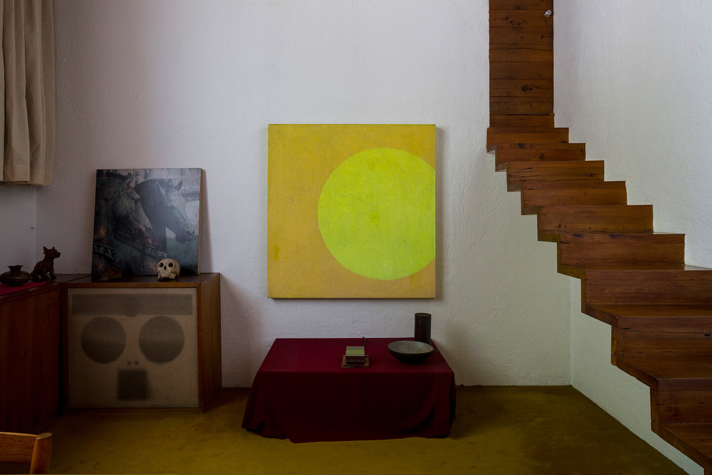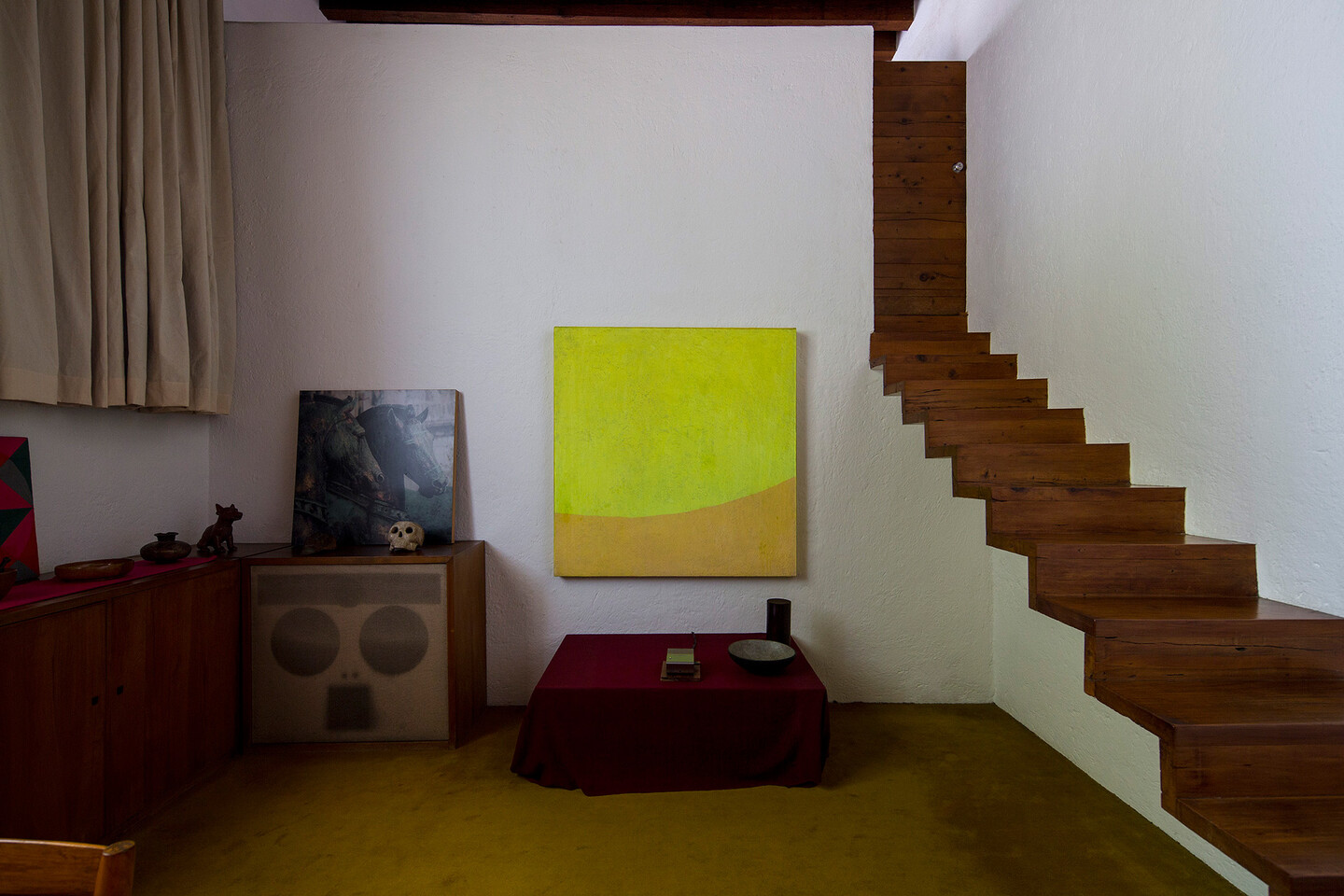 Lastly, in the library of the house we find the short film Horsehair, Confetti, and Rice (2019), projected directly onto a yellow monochrome made in Barragán’s architecture studio. The film is a piece of experimental cinema, with a strong emphasis on materials and textures, where a wealth of colors and shapes unravel. The hallucinatory quality of the film also alludes to historical artistic imaginaries that stem from both Mexico and Morocco. As such, the exhibition pays homage to the strong influence of Morocco’s vernacular architecture—and the country’s material culture in general—on Barragán and his friend and notable collaborator Mathias Goeritz’s architectural oeuvres. Furthermore, Double Skin is framed within Barrada’s long engagement with architecture and the history of modernism through multiple past projects.