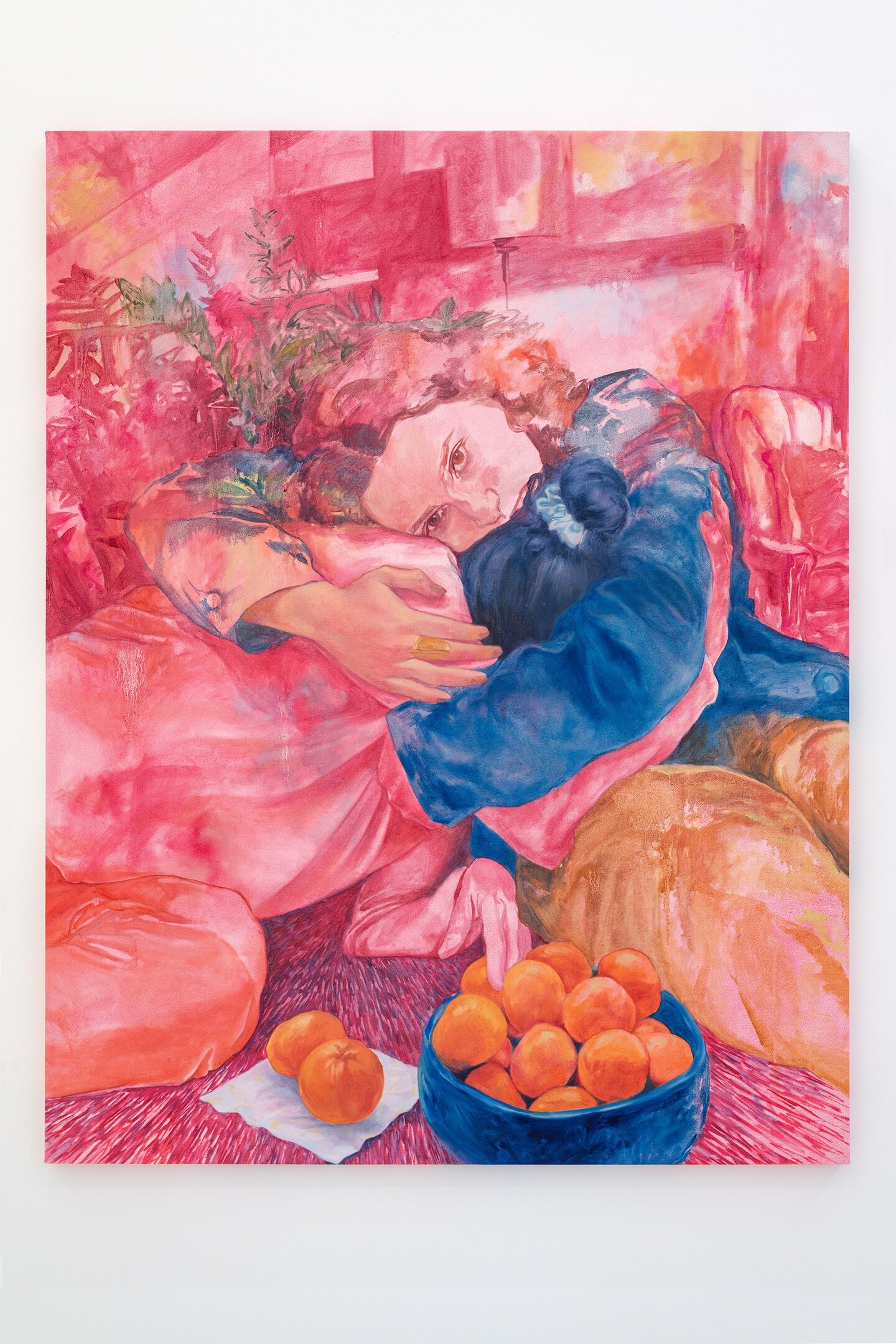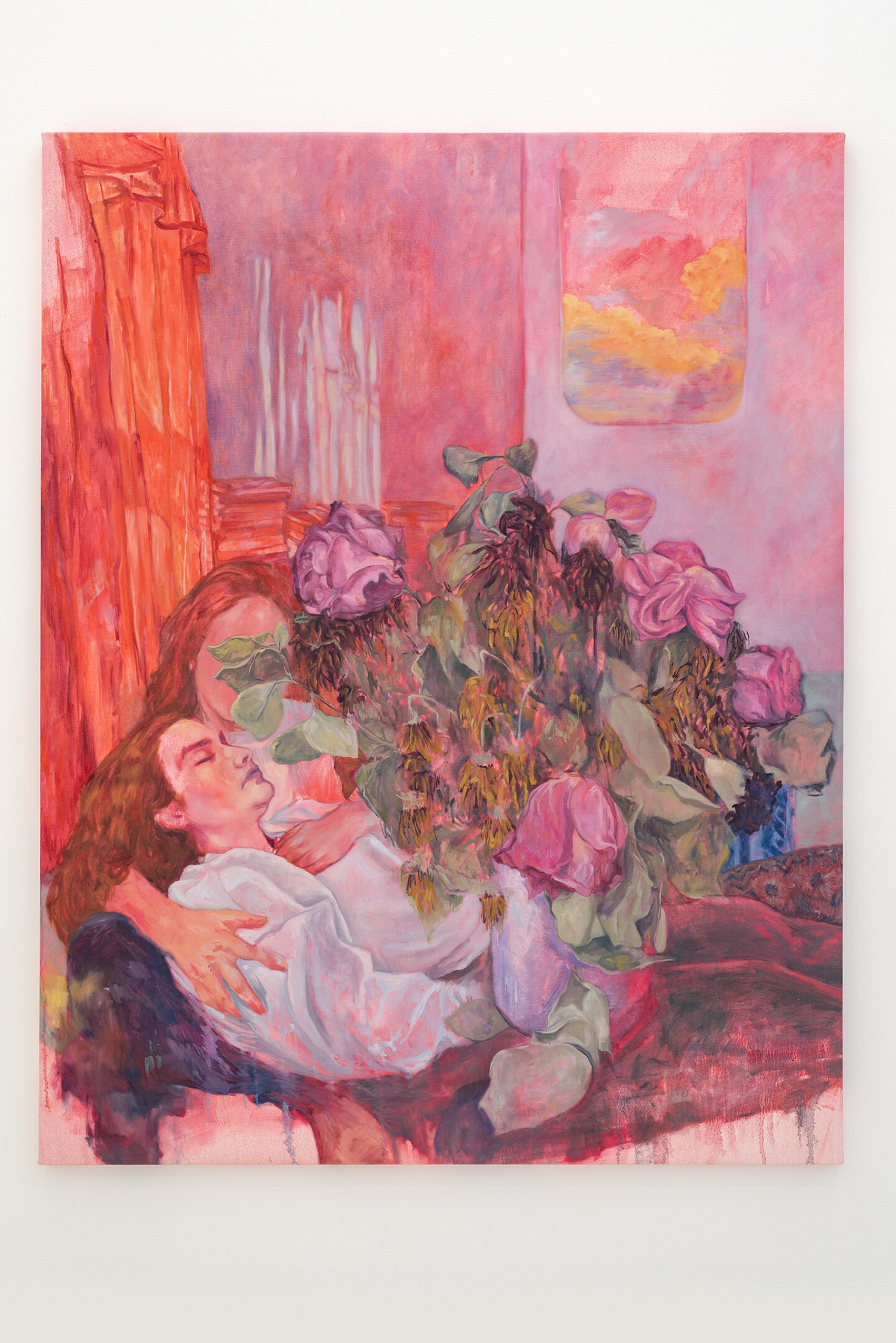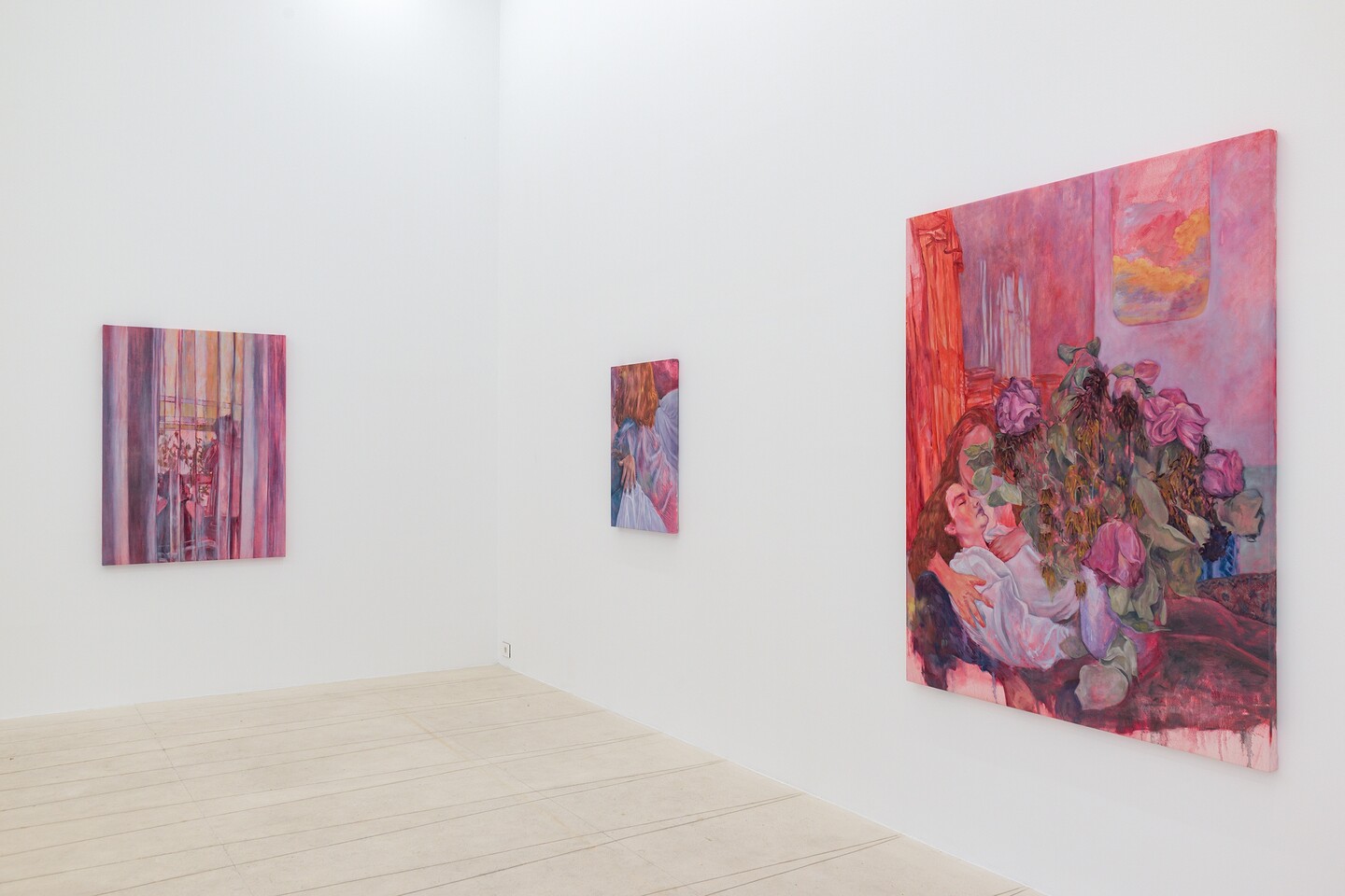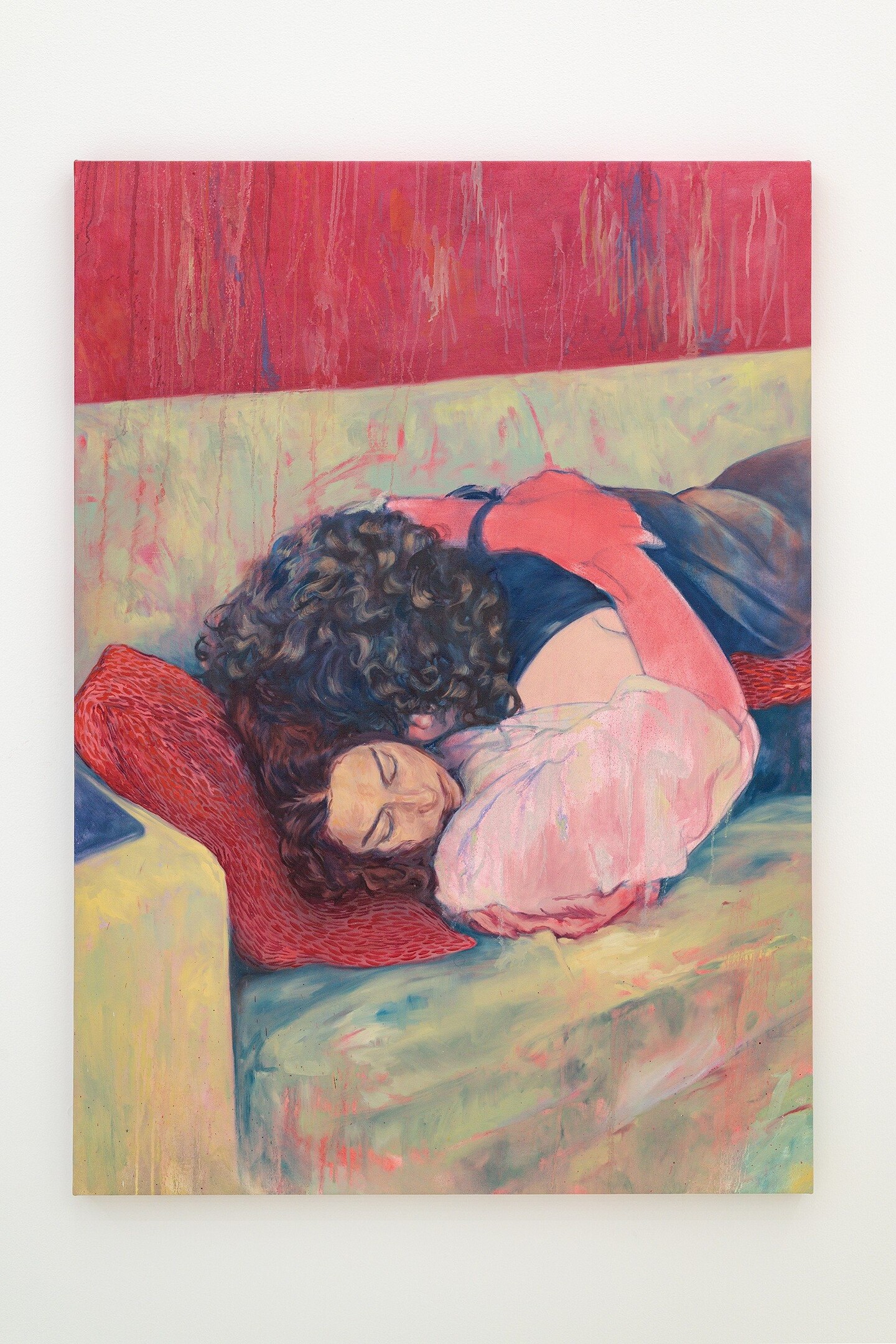 Dominated by reds and pinks, her figurative canvases capture scenes of fleeting sensual excess, set in the fragile moments when exhaustion has set in, realization is dawning, and both bodies and minds absorb the weight of the events that envelop them. Situated within the intimacy of living rooms and bedrooms, the works play with perspective and point of view, positioning the viewer as an unwitting witness to these unguarded moments. Inconspicuous everyday objects offer hints of narrative context, including a spoon left on a table, a newspaper carelessly tossed on a sideboard, the graphic on a T-shirt, a fading bouquet in a vase, or rumpled sheets.