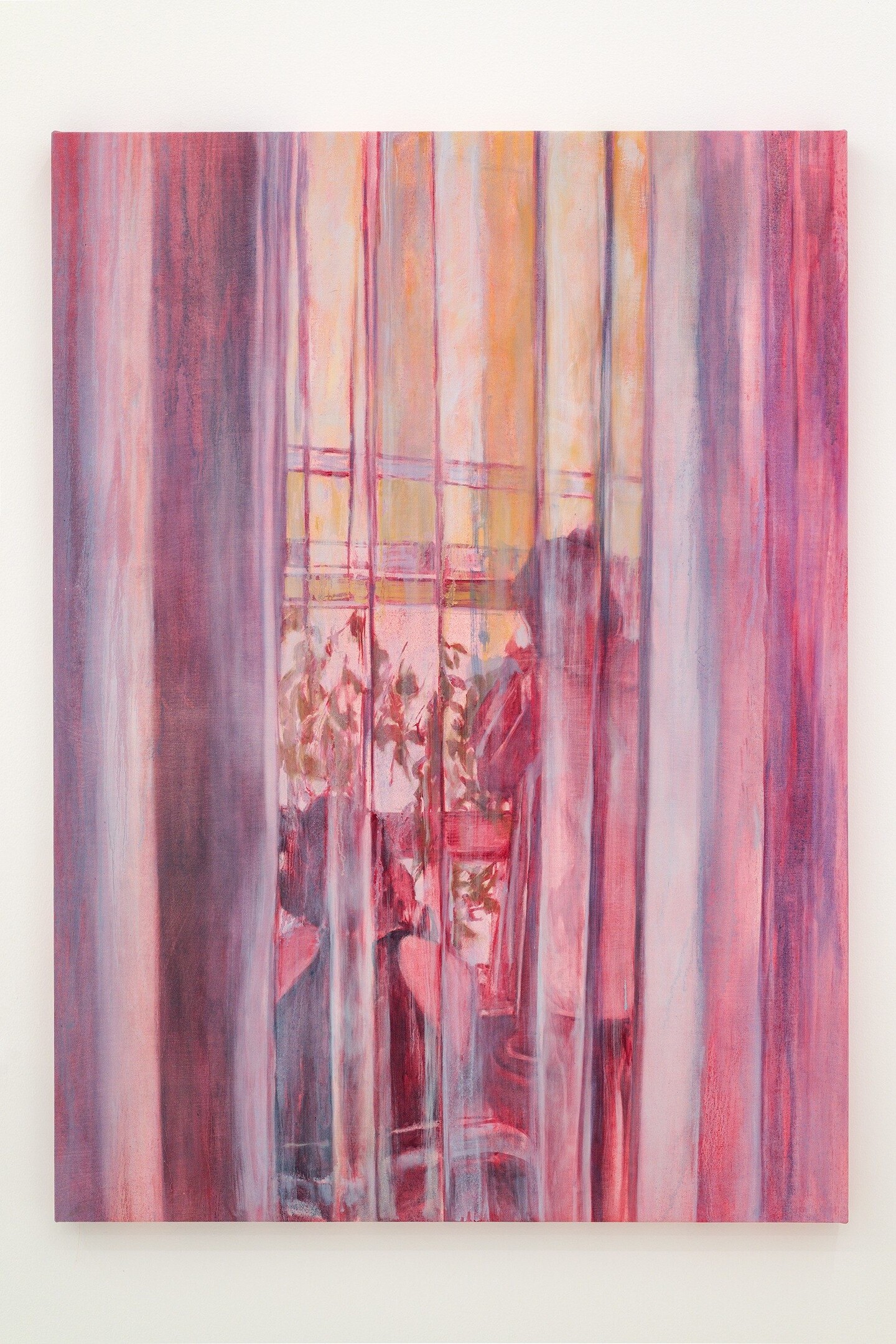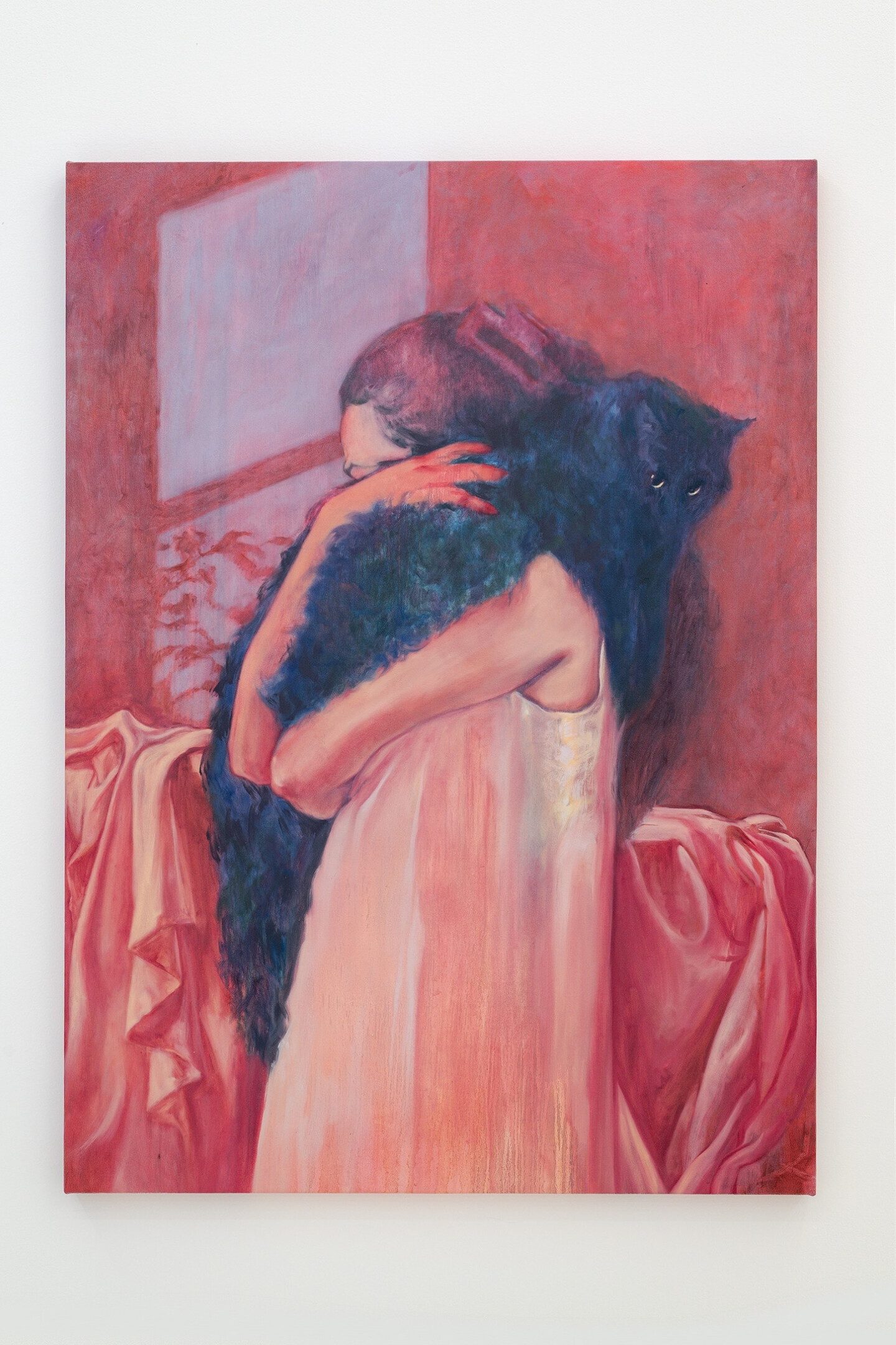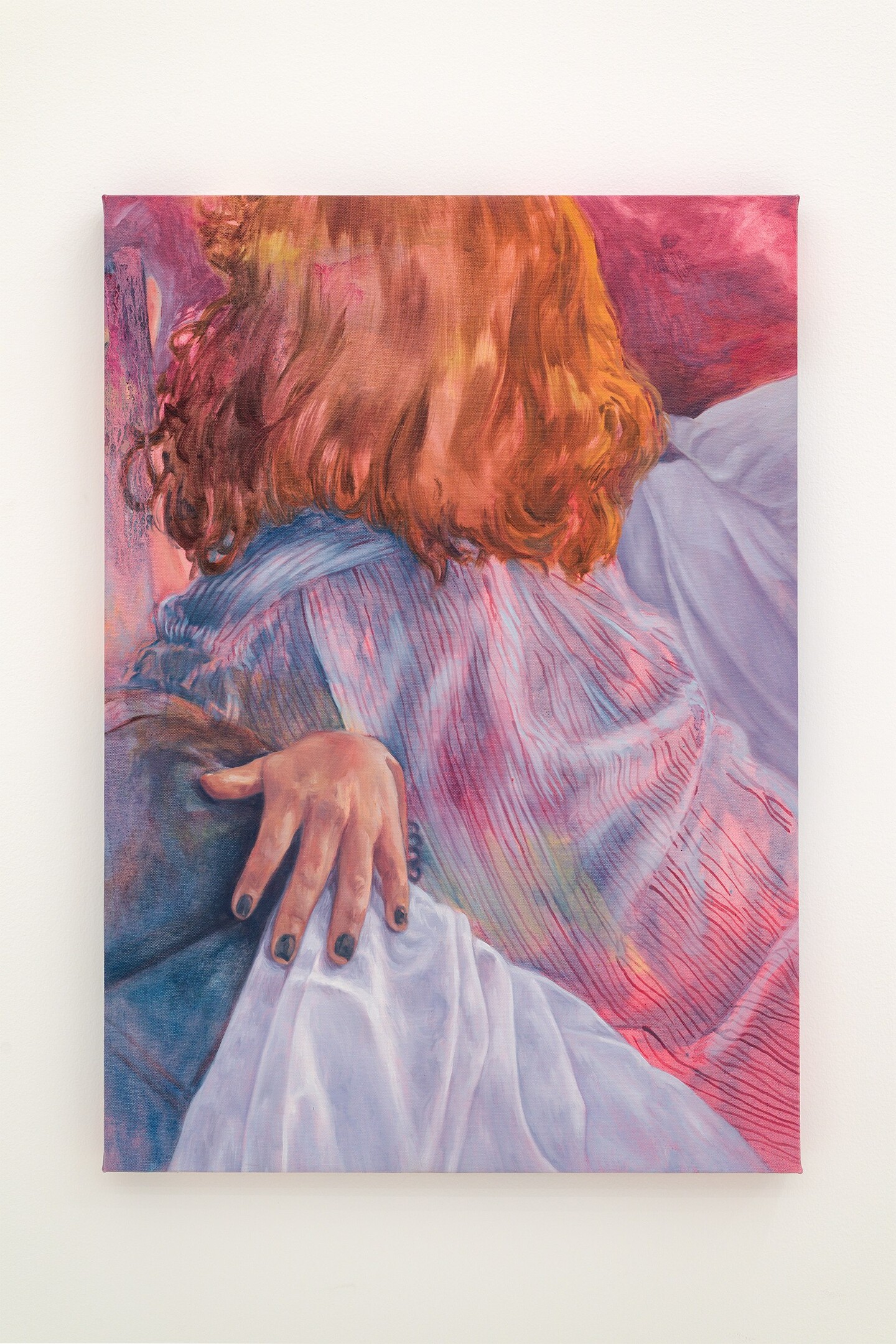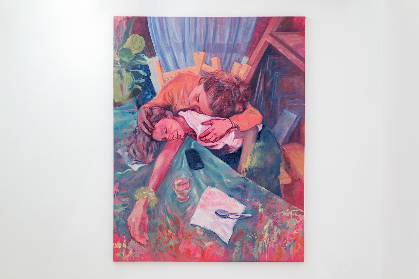 Dominated by reds and pinks, her figurative canvases capture scenes of fleeting sensual excess, set in the fragile moments when exhaustion has set in, realization is dawning, and both bodies and minds absorb the weight of the events that envelop them. Situated within the intimacy of living rooms and bedrooms, the works play with perspective and point of view, positioning the viewer as an unwitting witness to these unguarded moments. Inconspicuous everyday objects offer hints of narrative context, including a spoon left on a table, a newspaper carelessly tossed on a sideboard, the graphic on a T-shirt, a fading bouquet in a vase, or rumpled sheets.