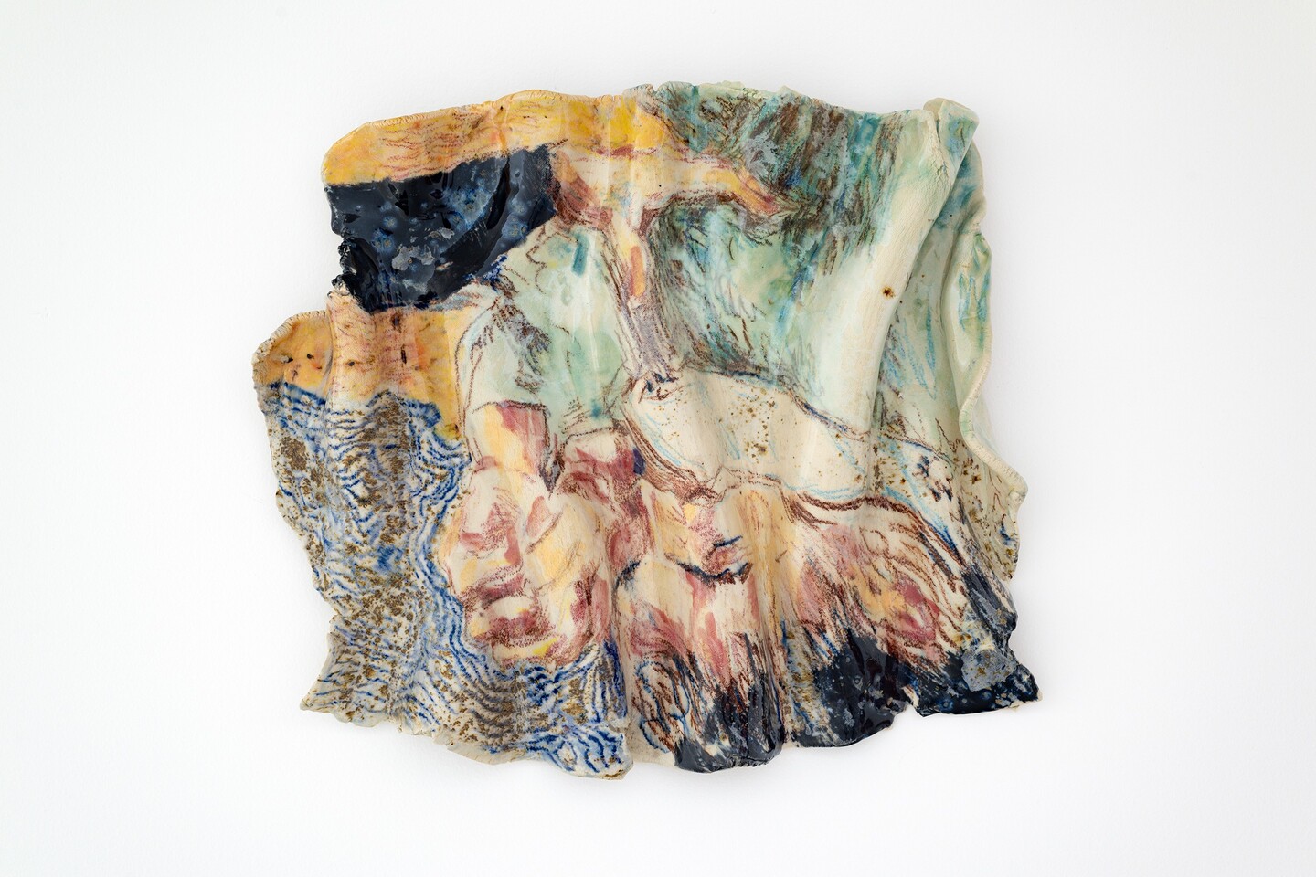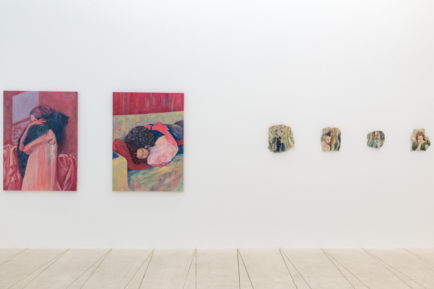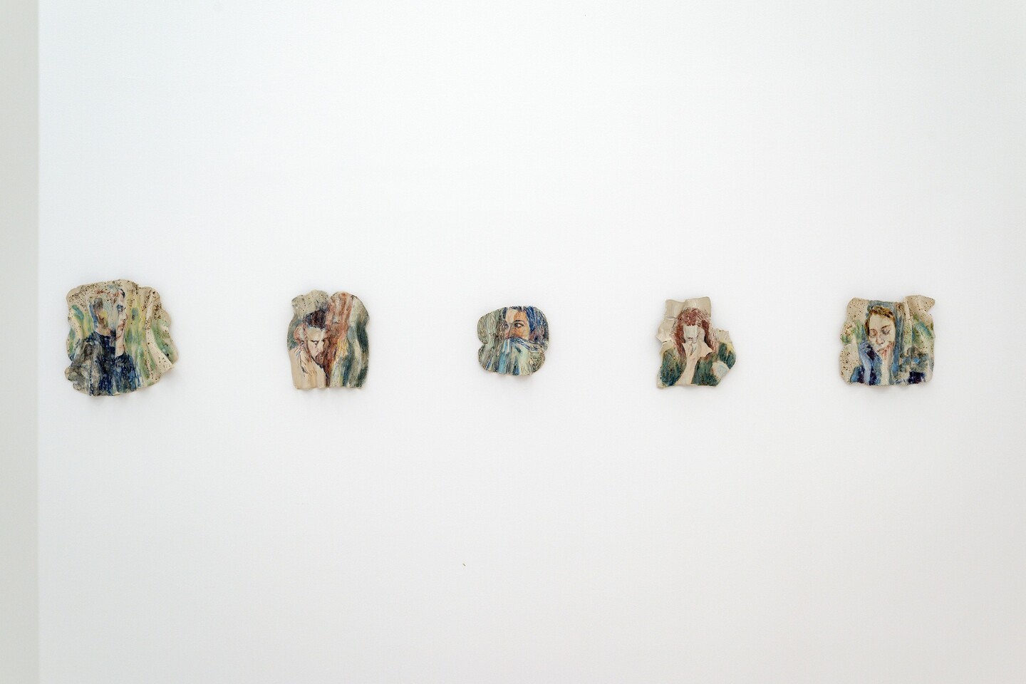 Forming a counterpart to the paintings, a series of ceramic sculptures lines the gallery wall. Kiwan shapes the clay into folds, fires it, and then paints portraits, faces, arms, or hands, before firing the pieces a second time. The heat of the kiln melts the paint and allows glaze particles to drip, softening the contours of the depicted bodies and bringing their felt experiences into sharper relief. What might look at first glance like isolated details, or fragments of life, actually forms a body of work that draws the viewer into a space of emotional and sensory engagement.