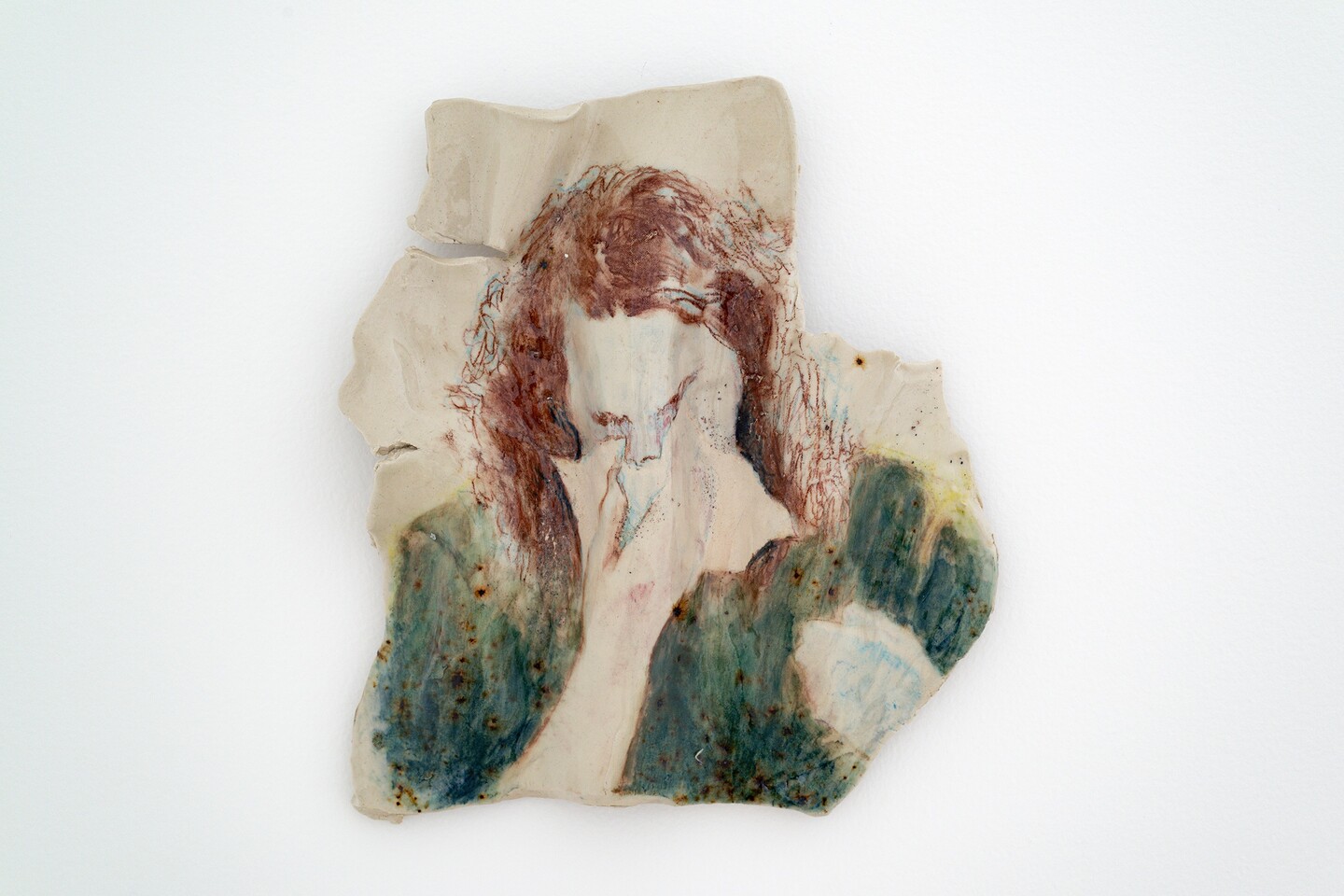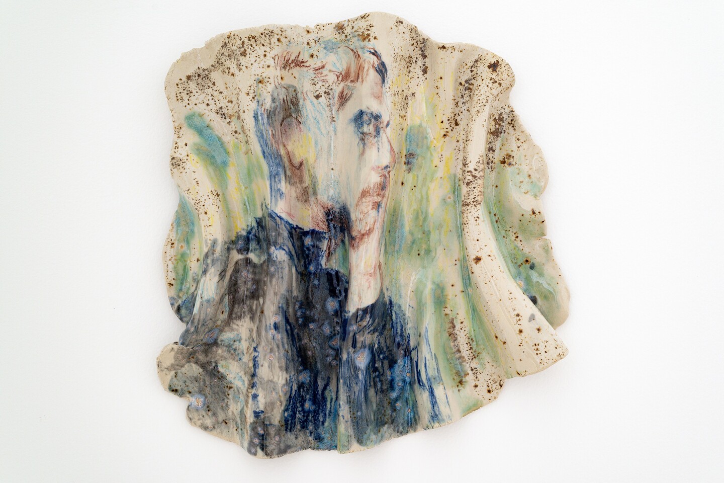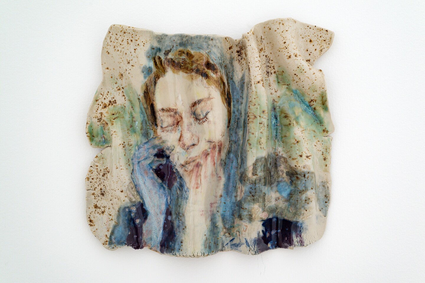 Forming a counterpart to the paintings, a series of ceramic sculptures lines the gallery wall. Kiwan shapes the clay into folds, fires it, and then paints portraits, faces, arms, or hands, before firing the pieces a second time. The heat of the kiln melts the paint and allows glaze particles to drip, softening the contours of the depicted bodies and bringing their felt experiences into sharper relief. What might look at first glance like isolated details, or fragments of life, actually forms a body of work that draws the viewer into a space of emotional and sensory engagement.