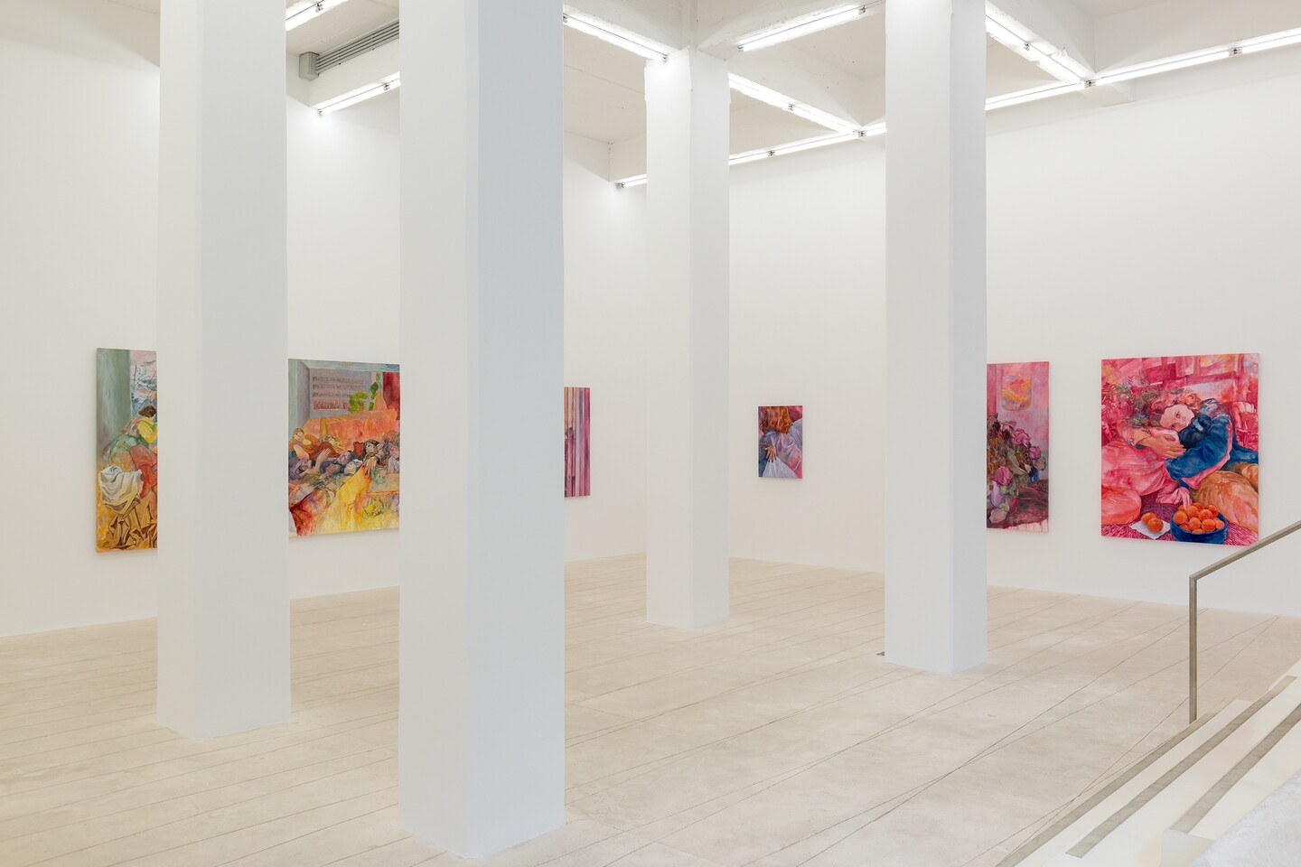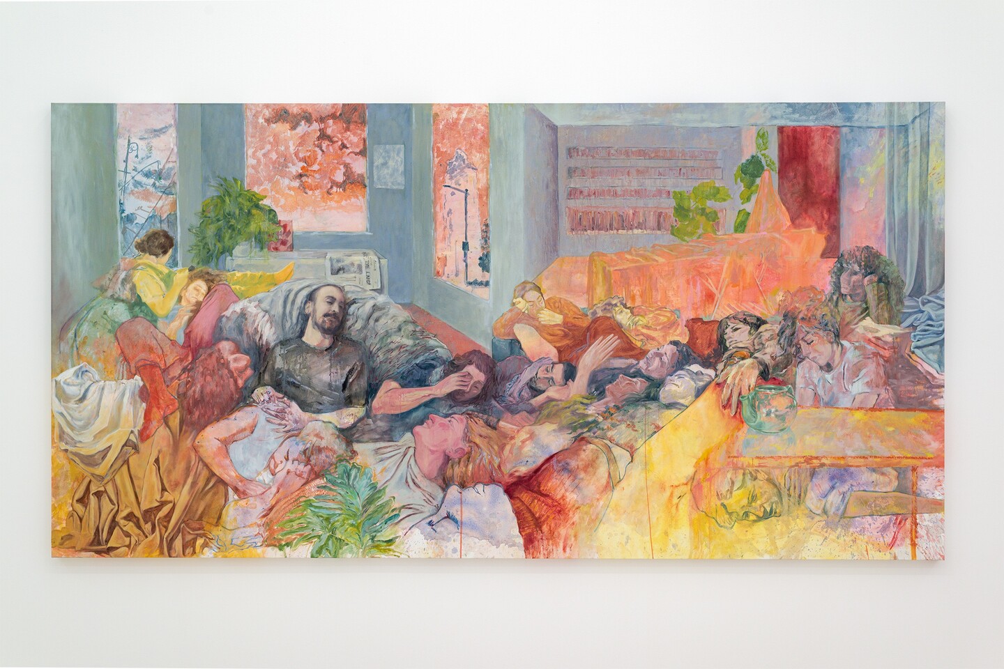 The central work of the exhibition, Intimate Trespasses, is a large painting measuring 178.5 × 349.5 cm, which lends its title to the show. In a Brooklyn apartment, glimpses of gatherings that followed demonstrations collapse into a continuous yet overlapping panorama. The persons portrayed are united by a shared belief that another reality is still possible. The painting unfolds the room, displaying the spilling of the political into the intimate.