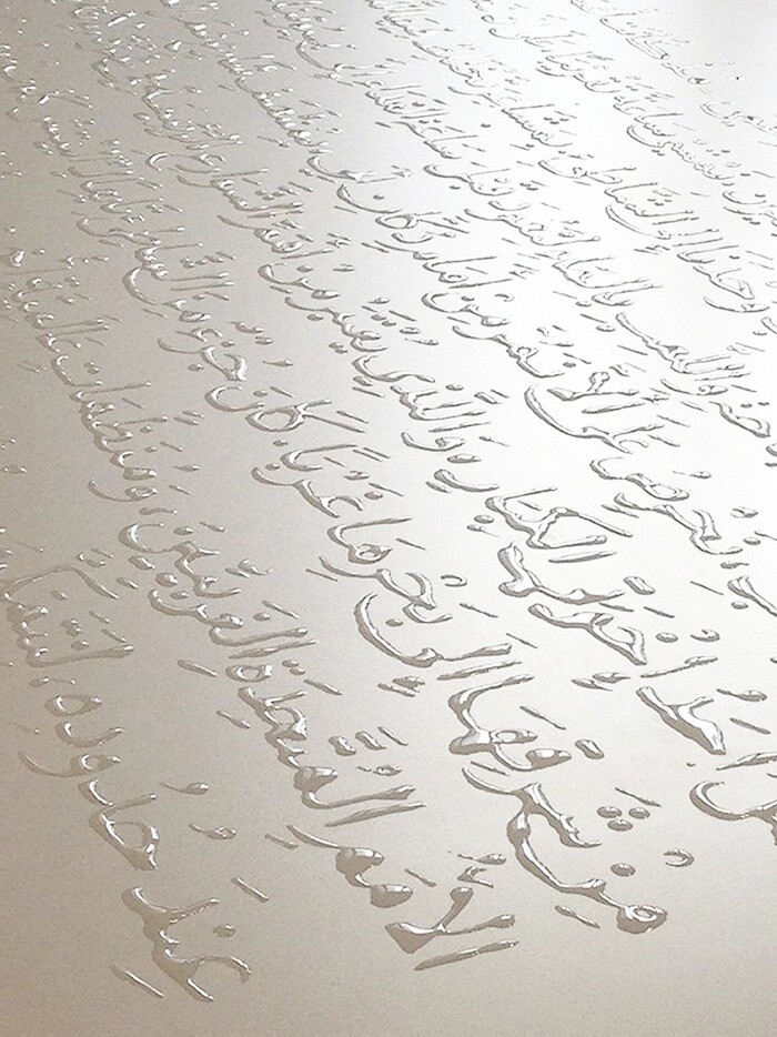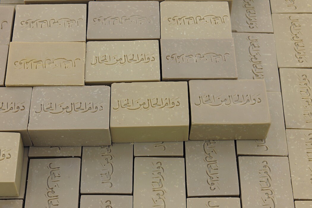 The entrance of the gallery features an installation of traditional natural soap to be distributed to visitors. The soaps are inscribed with an Arabic saying that translates to, “no condition is permanent”. The work is set in a block, resembling a brick wall, however, it contradicts this as it is in its nature to dissolve.