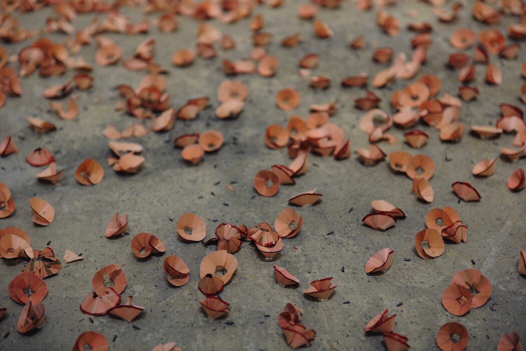 performance/installation, colour photograph, inkjet print on poster paper (100 × 150 cm), pencil shavings, various dimensions
