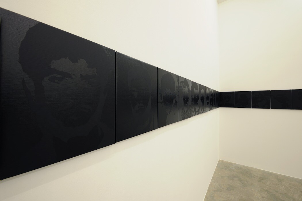 The deception in the viewer’s perception is also seen in his untitled work of silkscreens that sprawl across the gallery walls in a single line. At first sight the work appears to be a dark blank line, but once the perspective is changed, the blackened faces of Palestinian martyrs from the second Intifada appear. Like forgotten ghosts, their faces fade in between the visible and invisible