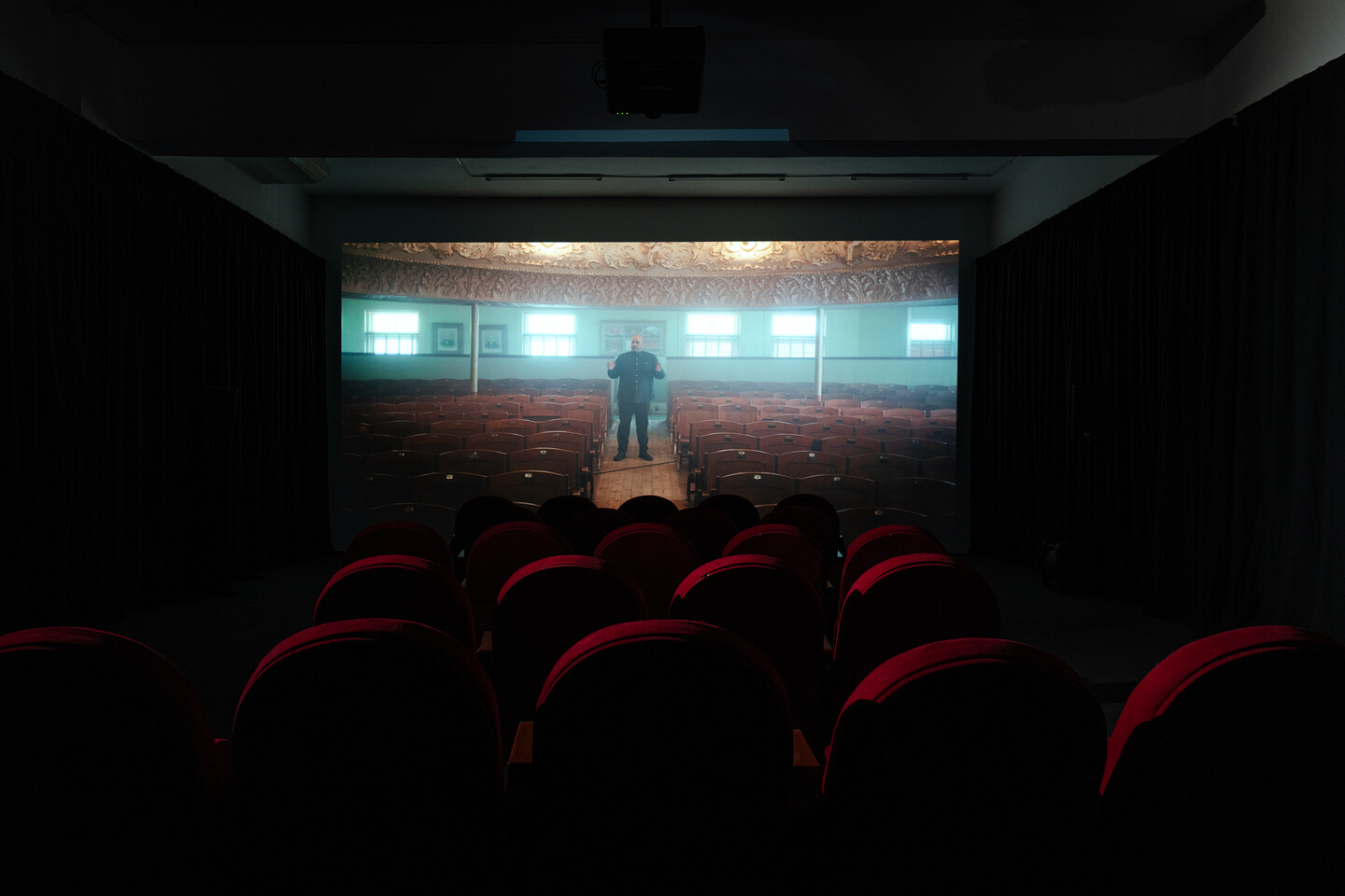 single-channel video projection, color, sound, amplifier, 53 × 20 × 20 cm, (amplifier), 71 × 70 × 25 cm (speaker)