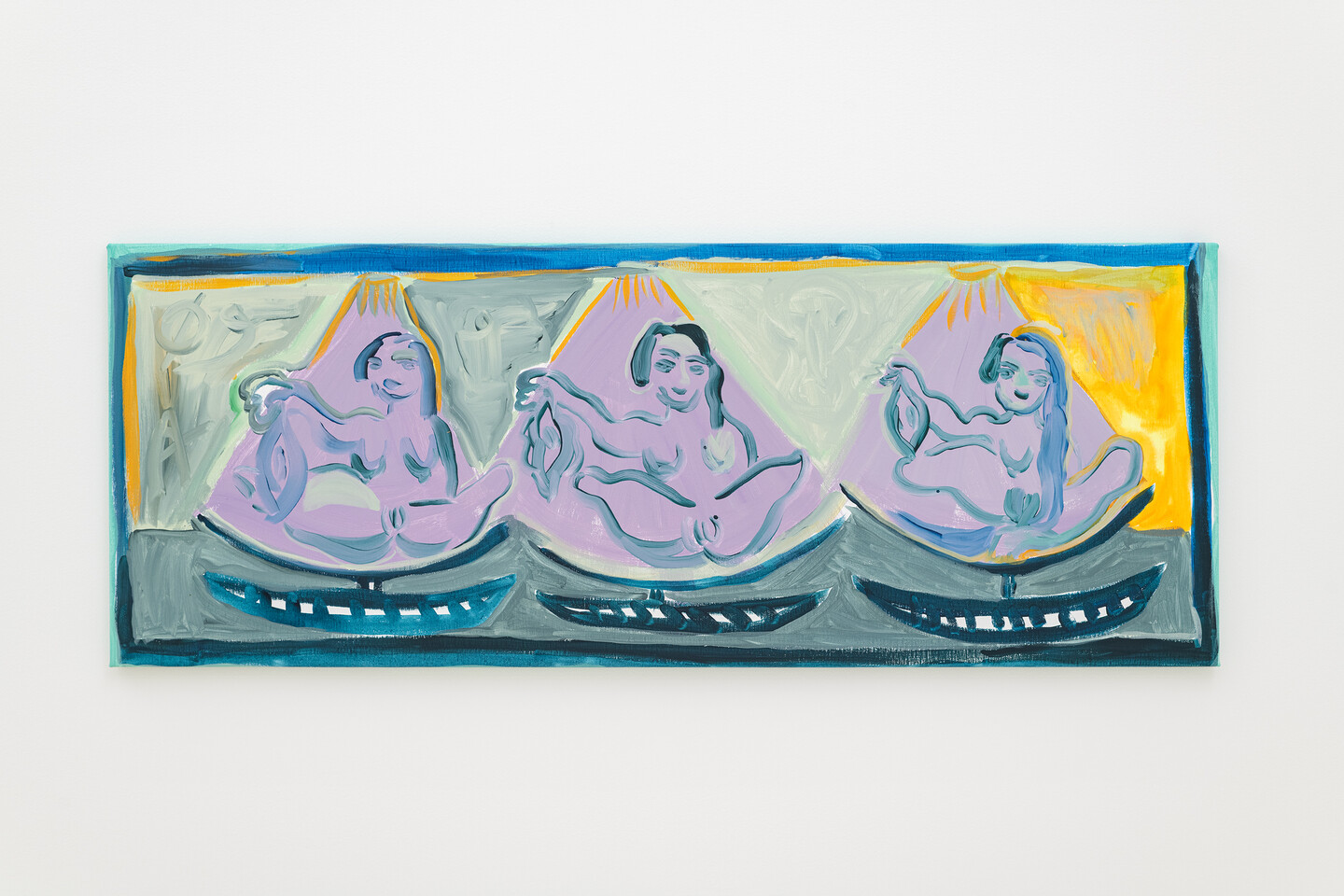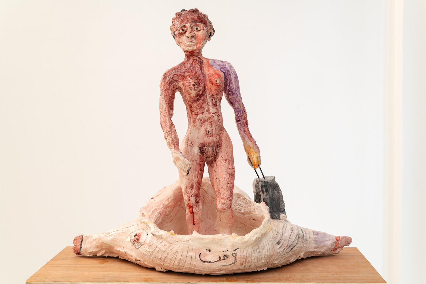 Responding to the Lebanese Emigrant statue—created in Mexico in the late 1970s, with numerous replicas placed worldwide, including a monumental version installed at Beirut’s port in 2003—Al Solh presents a glazed ceramic sculpture that surveys the viewer from the gallery’s windowfront. Depicting a female traveler instead of a male figure, the piece features a naked woman standing in a shell-like boat called “time” in Arabic. The voyager proudly displays the nail polish on her bare toes, a knee bent as if captured in the act of deliberately moving forward. She pulls behind her a modern carry-on suitcase.