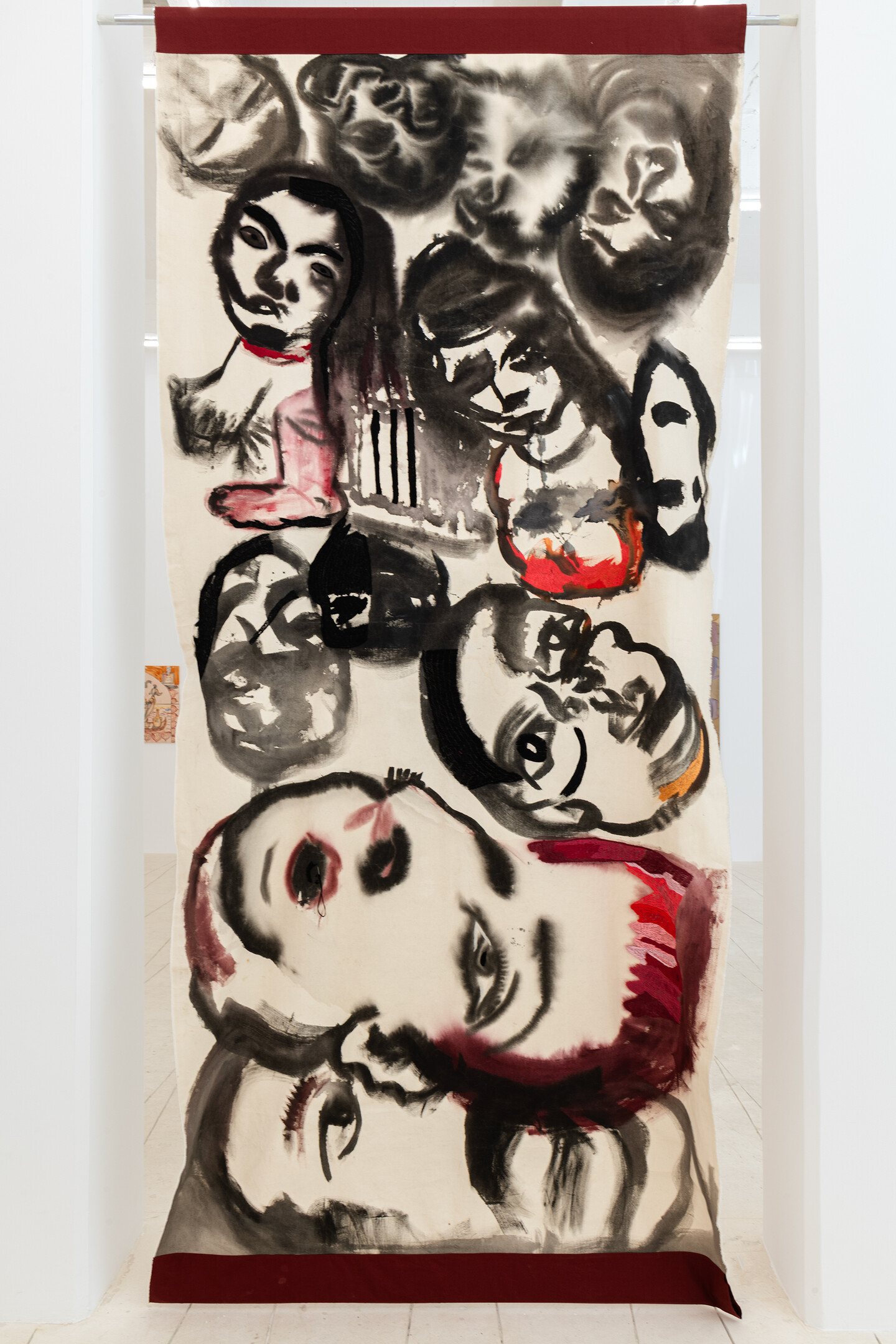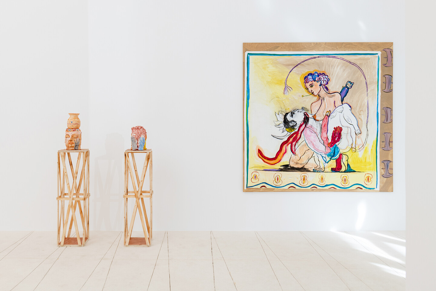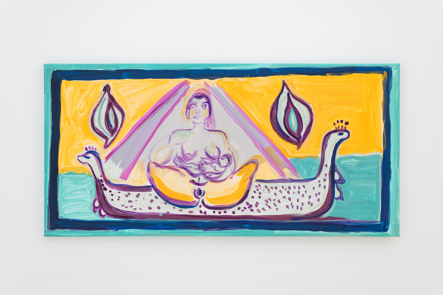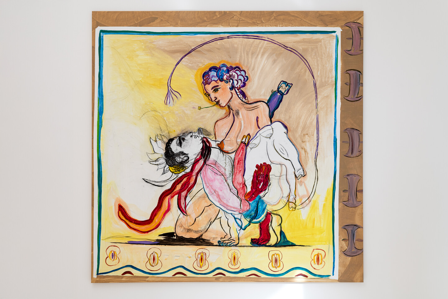 Equally dissident, the most recent series of paintings produced for the exhibition are made with acrylic on canvas and celebrate the female as the giver of all life. Reminiscent of Courbet’s L’Origine du Monde, they seek to reframe the role of women throughout centuries, as the fundamental transmitter link that allows history to unfold.