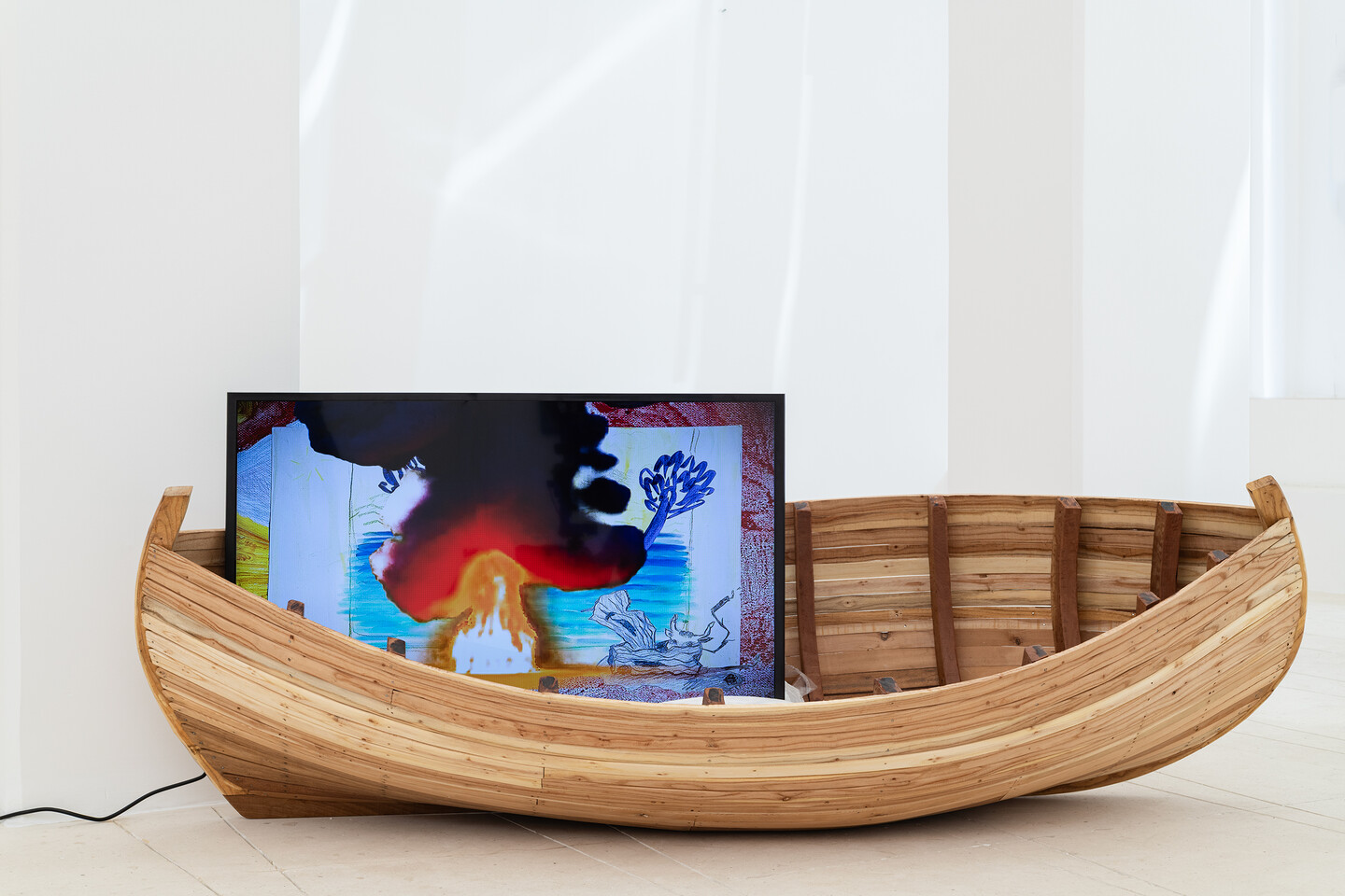 In the center of the gallery space, a wooden fishing boat nods to our ancestral links to the sea, a source of sustenance, of economic boon and a passageway all at once. It carries a flat TV screen with Al Solh’s newest video work, Two Airplanes and the Luggage. The animated cartoon video shows Europa fleeing over the water, abandoning her suitcase and the bull that’s an intrinsic part of her story, to escape bombings – and possibly the shackles of her own myth. The artist whistles, hums and buzzes the score herself, mimicking in turn bird chirping, war planes and explosions.