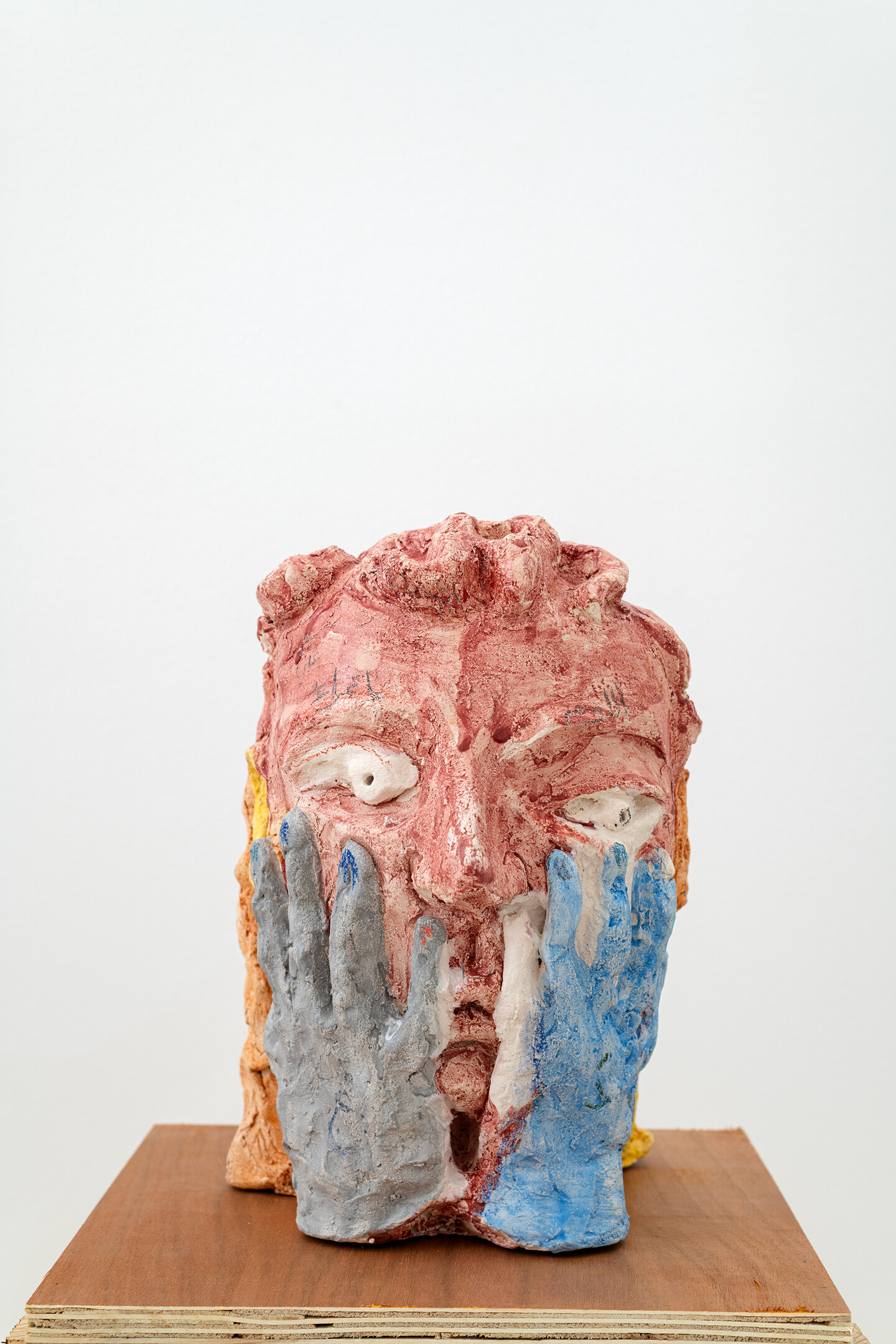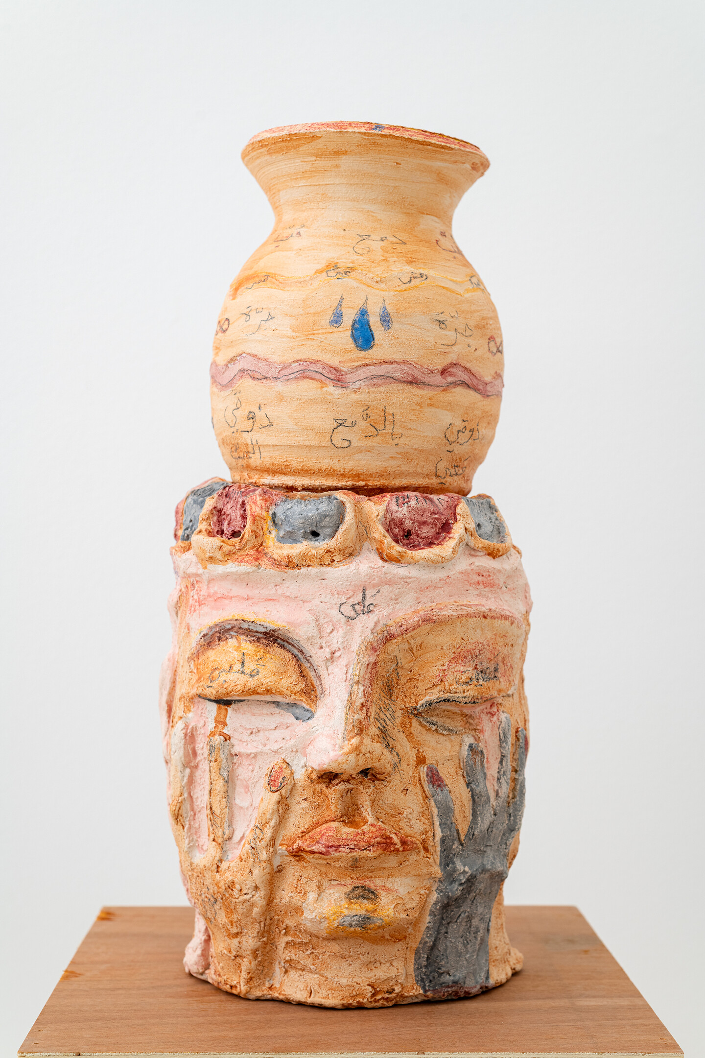 This tension between ancient references and modern times surprises visitors throughout the exhibition. From the ceramic mural pieces to the trompe l’oeil paintings on canvas, Mounira Al Solh intertwines motifs found on antique mosaics, bas-reliefs or Phoenician lettering with depictions of boats, or female figures, all the while keeping to an earthy color palette. In one of the larger works on canvas, the artist combines yellow natural pigments and Phoenician red to reimagine Europa. Instead of being abducted by him, the princess here cradles the half-human-half-bull Zeus, in a stance that negates the damsel in distress narrative. Two sculpture heads clutching their faces with their hands rethink the act of crying as a performative ritual, hollowed out at the top to leave room for a lachrymatory.