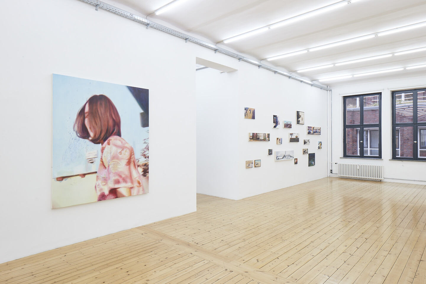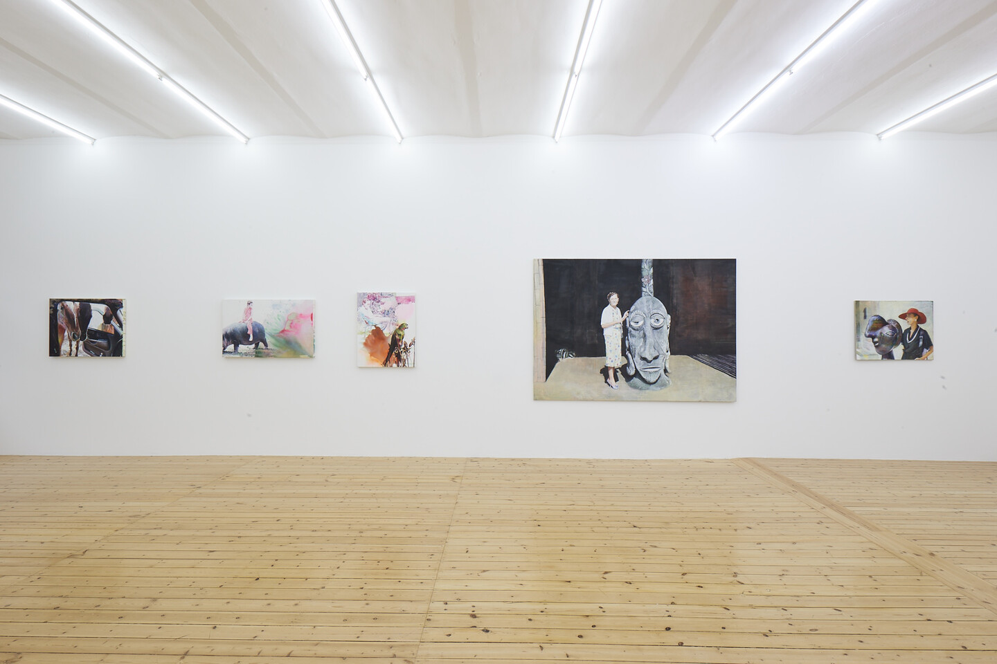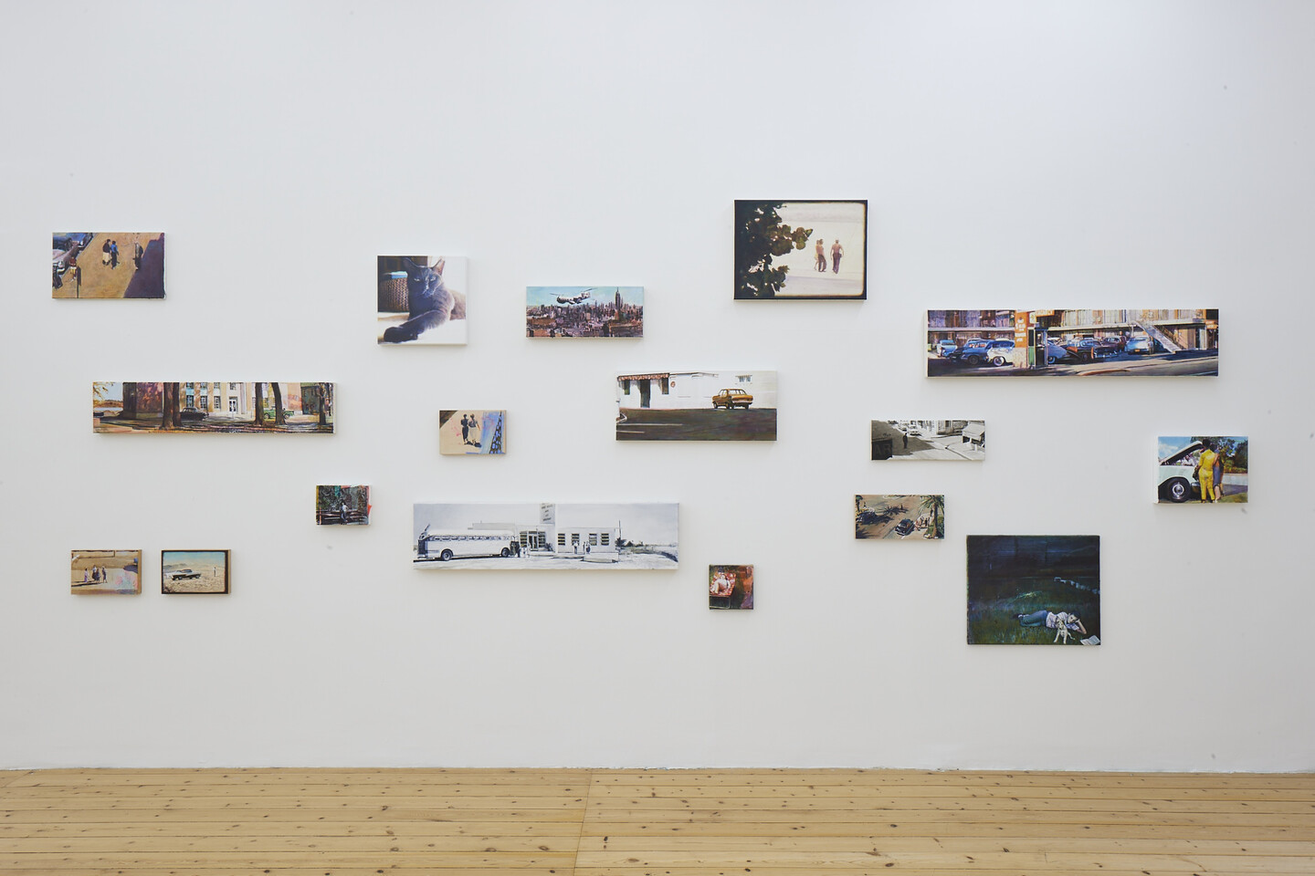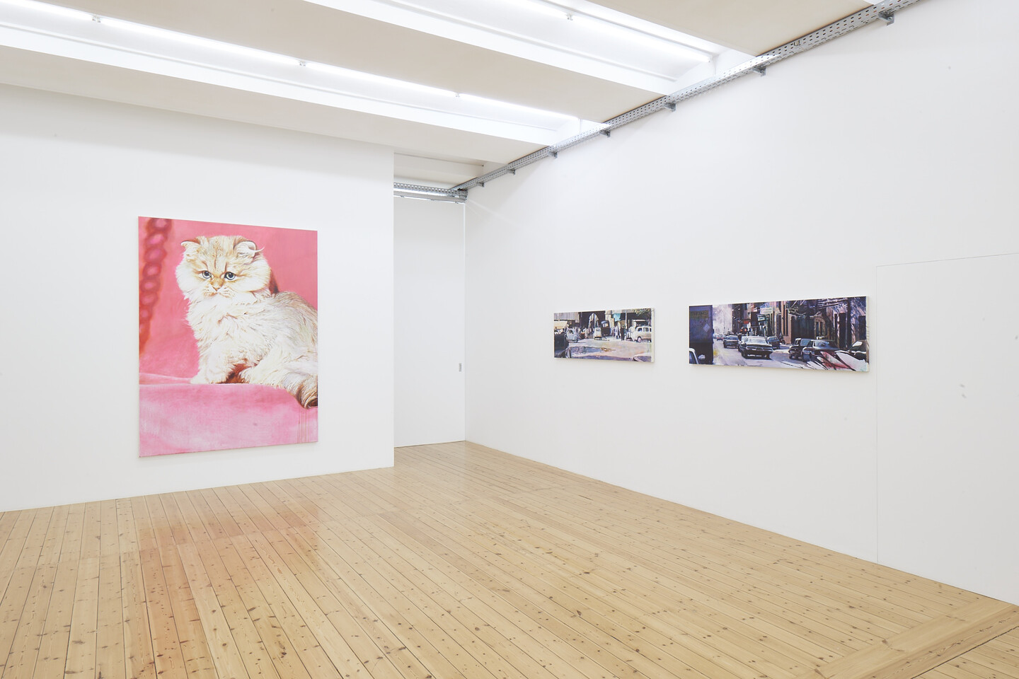 FLORIAN THOMAS (*1966, lives and works in Munich): A woman, blinded by the sun, poses next to an African head statue; a girl rides a hippo; an oversized cat majestically sits against a pink background; street scenes, cars, animals, people... the subjects in Thomas’ paintings reveal their origins: postcards, personal pictures, analog photos, or digital ones found on the internet.