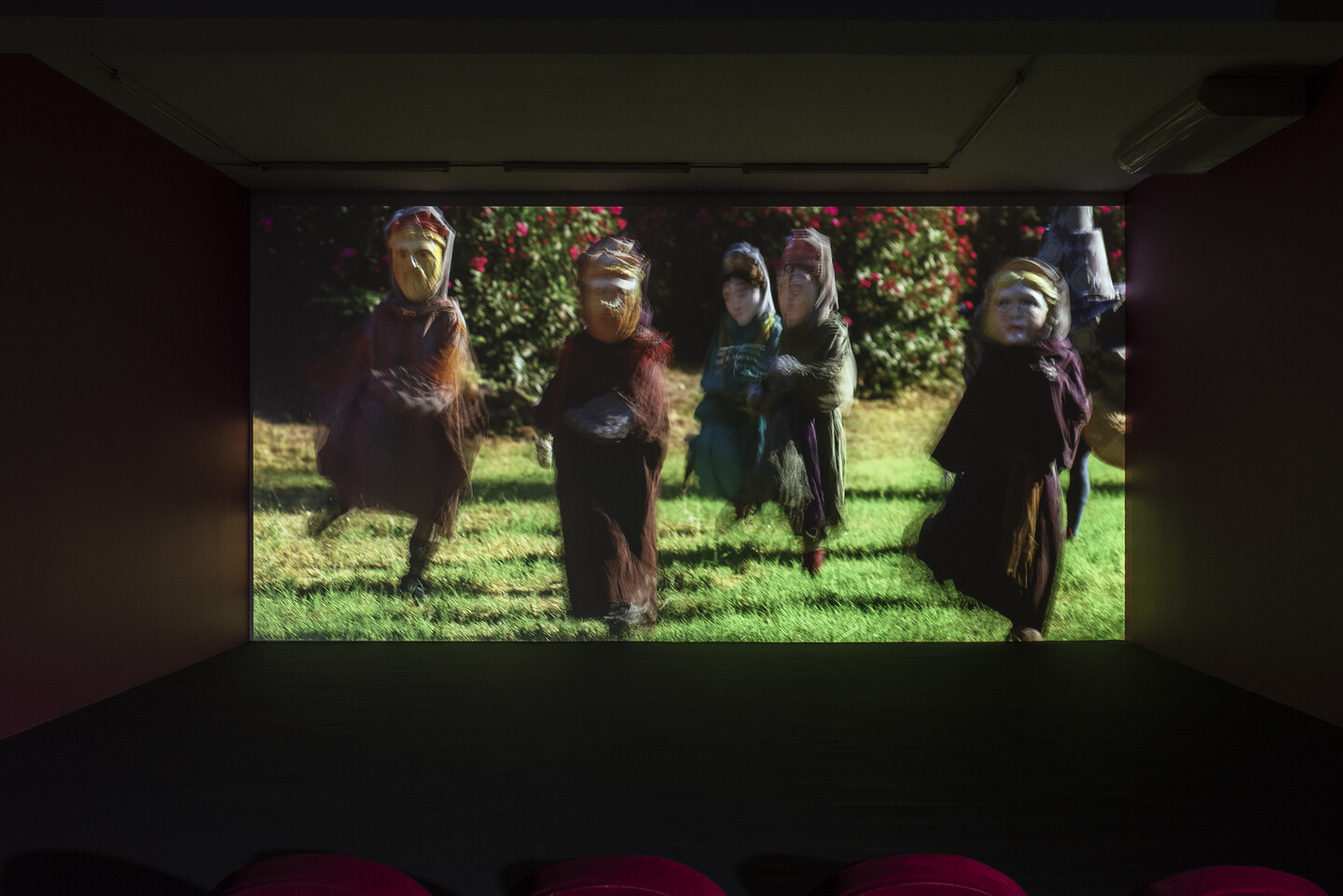 The surrealistic hybridity of the film is translated throughout the exhibition. The metallic Pompeian red walls turn the space into an infinite skyscape, creating an atmosphere that accentuates the grotesque grimacing faces of the masks borrowed from the set, and the phantasmagorical colors of the paintings which depict a flow of subjective, fictitious ideas around this morphing of historical-cultural material.